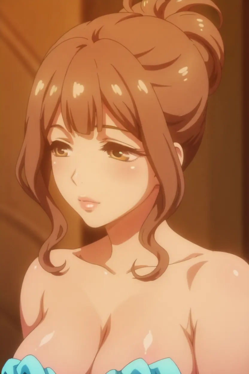 Torino Kazami (Valkyrie Drive Mermaid), brown eyes, brown hair, updo, lips, glossy lips, thick lips, gigantic breasts, Valkyrie Drive Mermaid_art_style, 4k, HD, superb quality