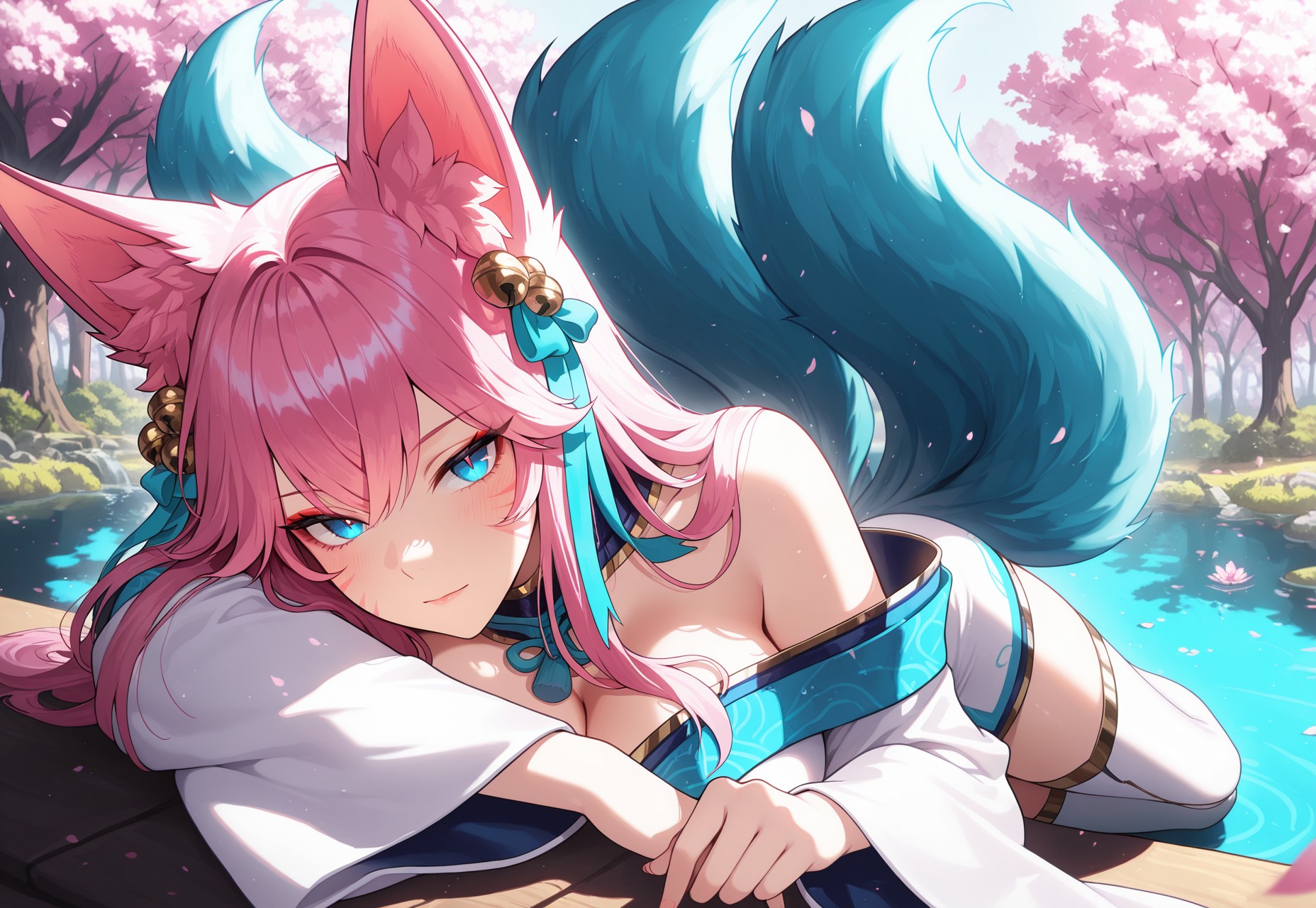 SBahri,pink hair,long hair,hair ornament,fox girl,fox tails,blue tails,multiple tails,blue eyes,whisker markings,japanese clothes,bare shoulders,cleavage,multicolored dress,wide sleeves,thighhighs