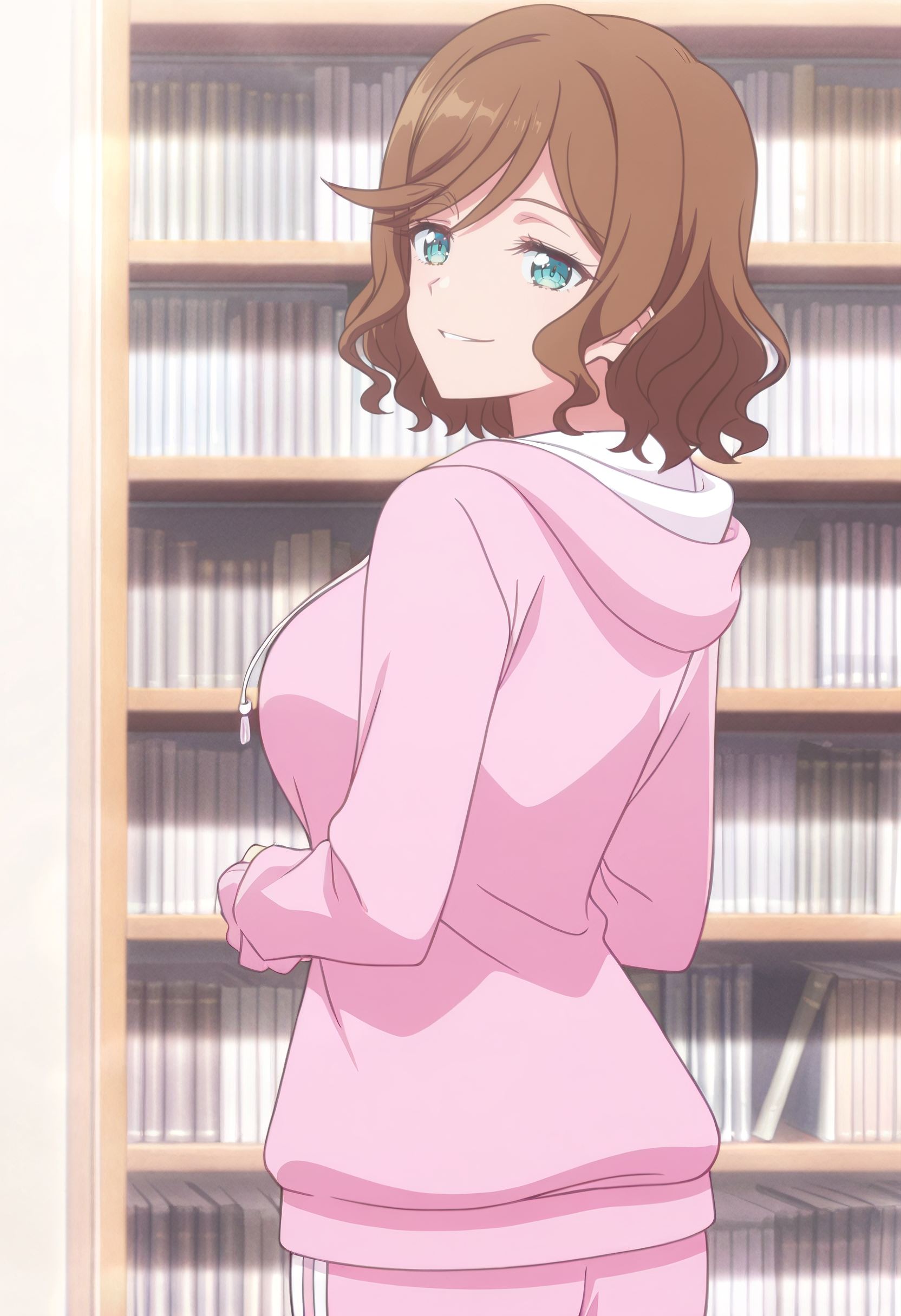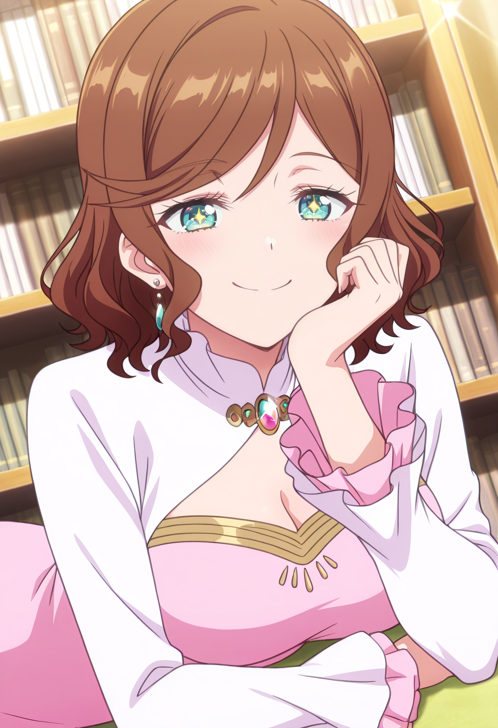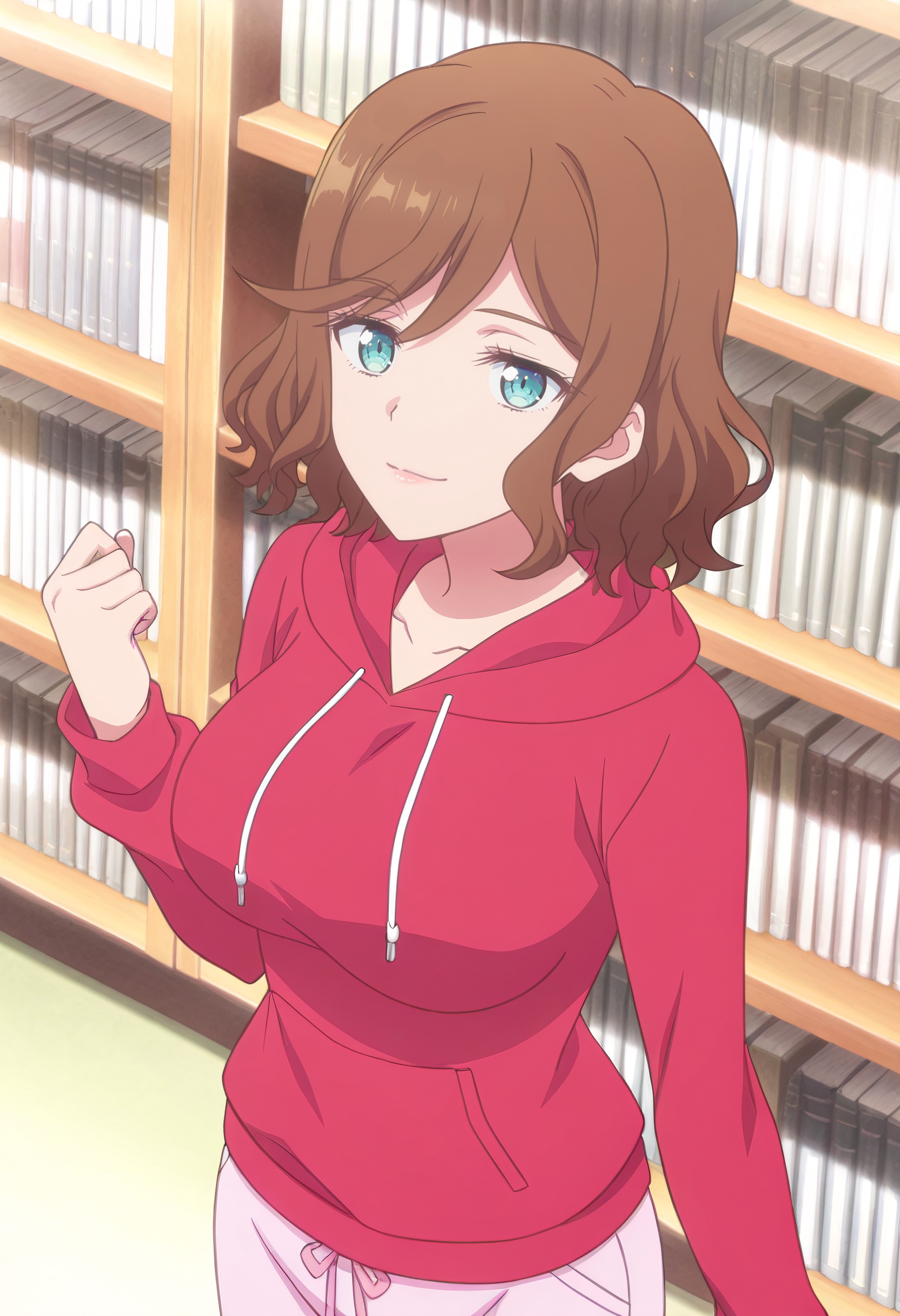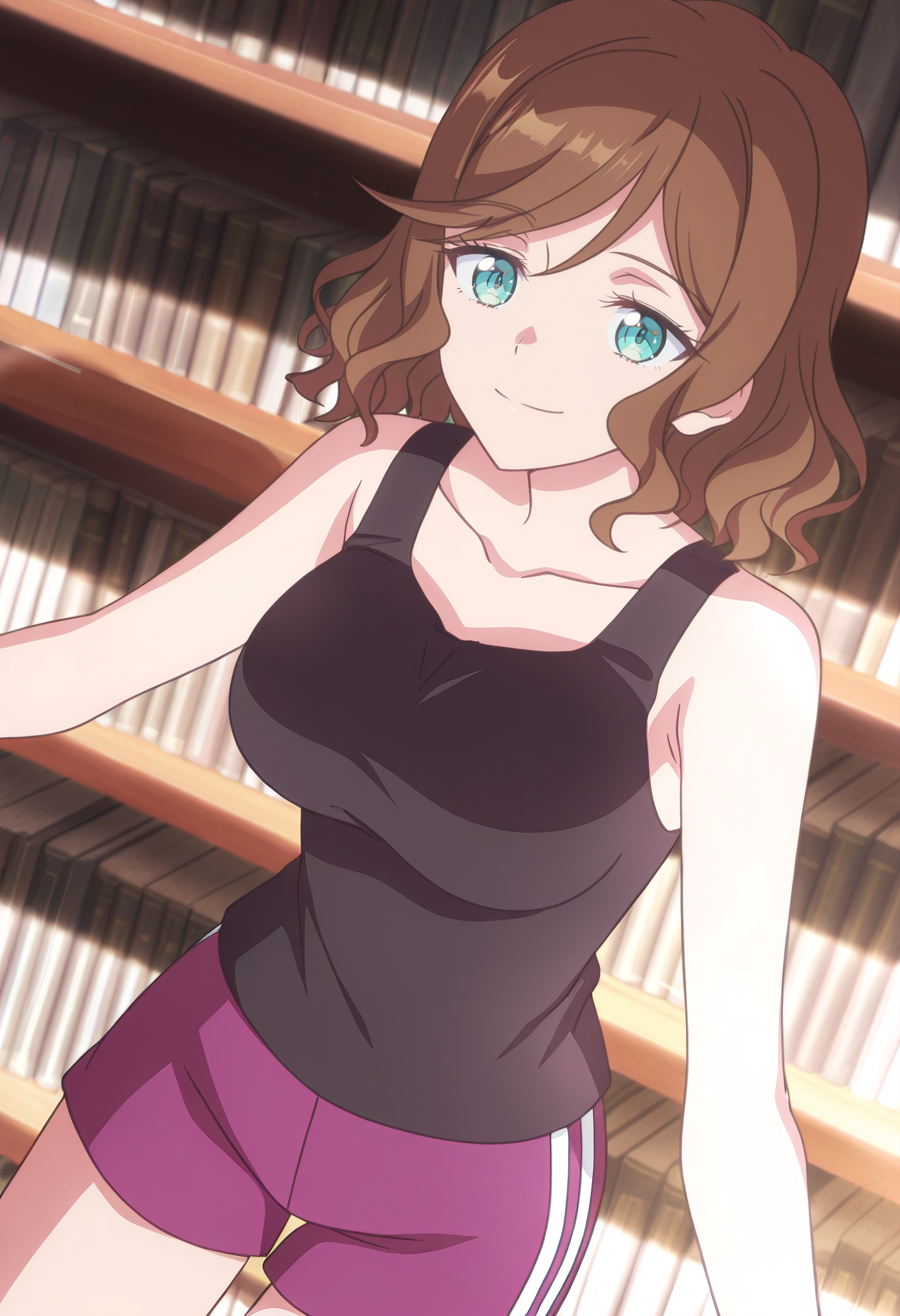 KTAmanda、茶色の髪、短髪、ウェーブヘア、青い目、本棚、サイドスルーの前髪