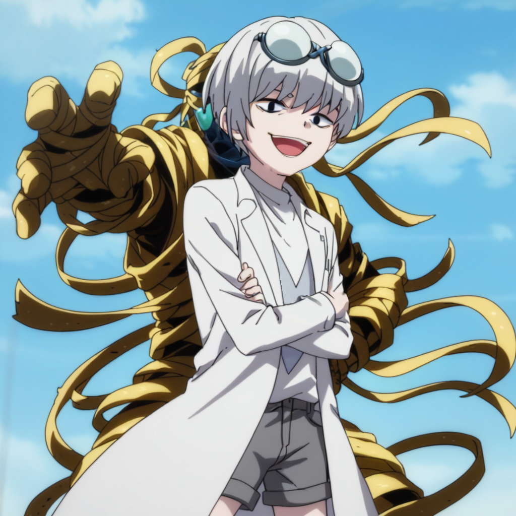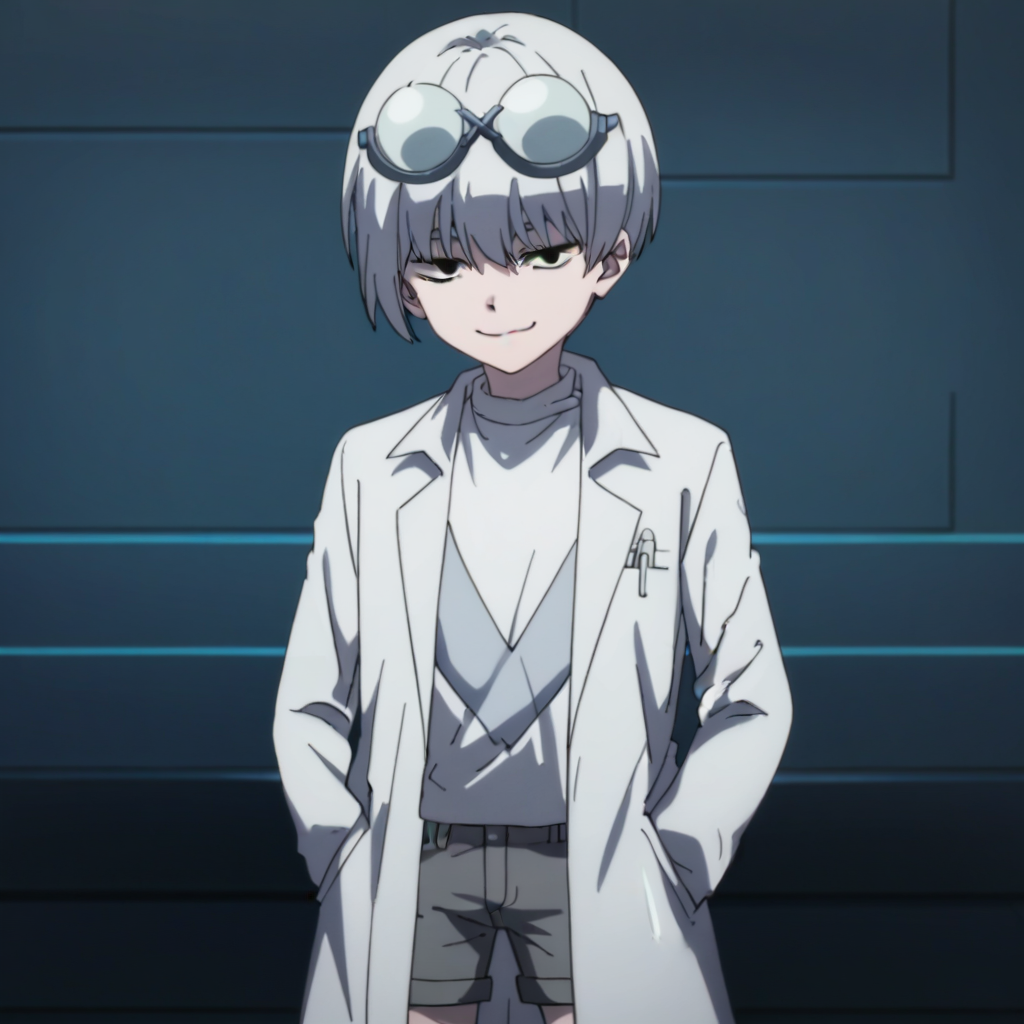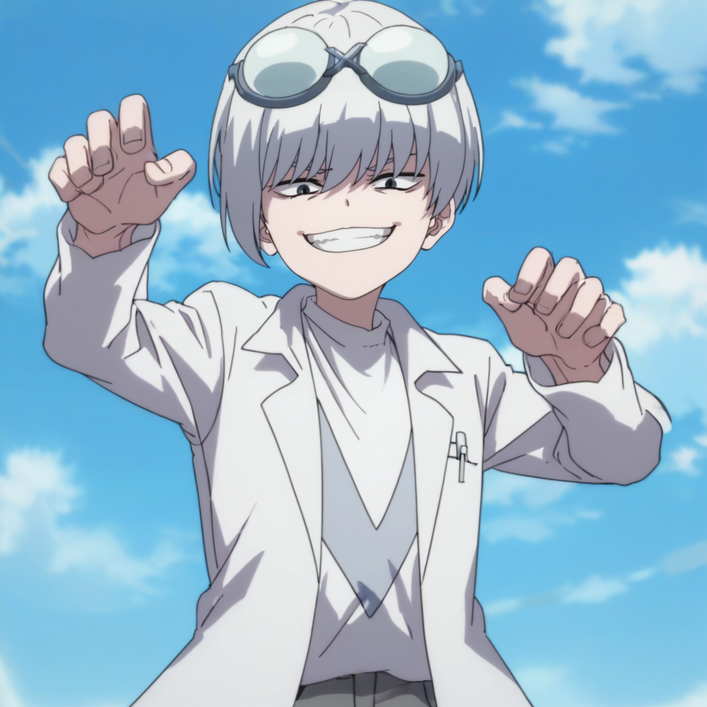 プロンプト:男性、白髪、ゴーグル、頭にゴーグル、黒目、半閉じた目、実験服、白いアンダーシャツ、開いた服、グレーのショートパンツ、靴下、グレーの靴、屋内(実験室/暗い/モニター/画面)、屋外(空/雲/タイル床)