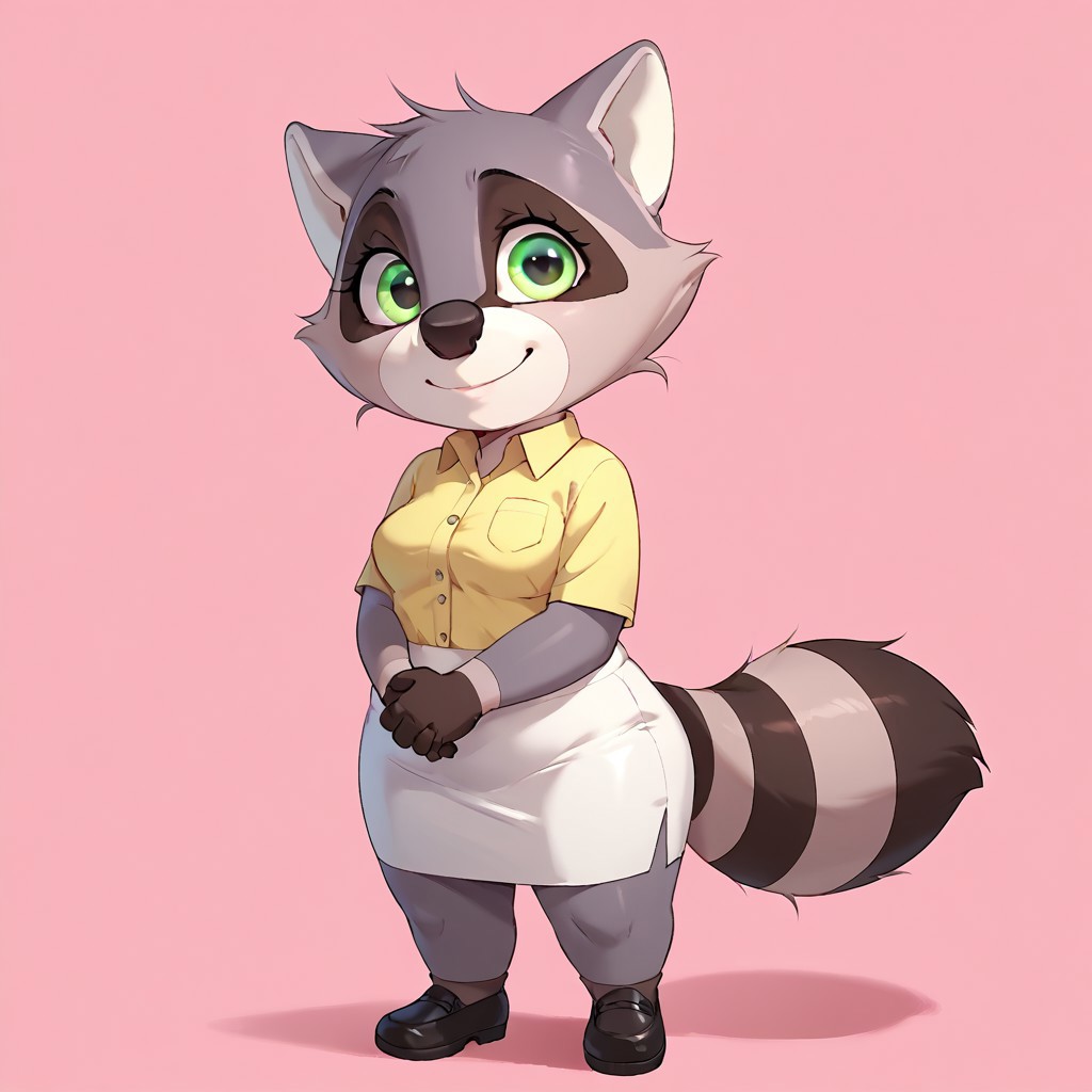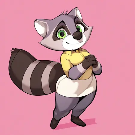 raccoon, raccoon girl, black and gray fur, green eyes, black nose, white snout, raccoon ears, raccoon tail, shortstack, medium breasts,