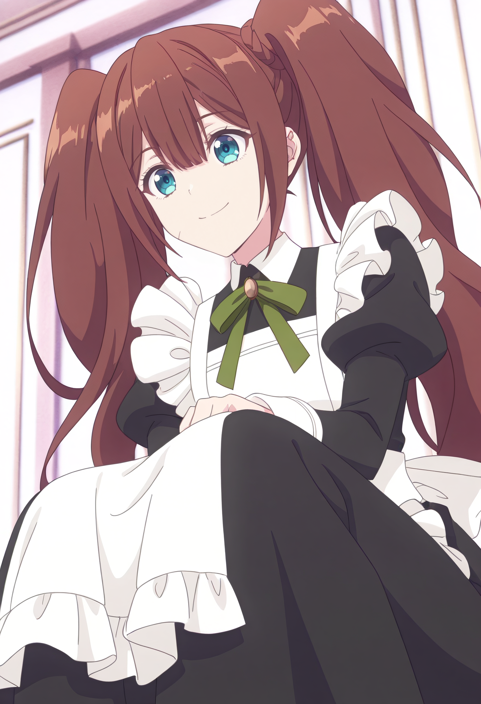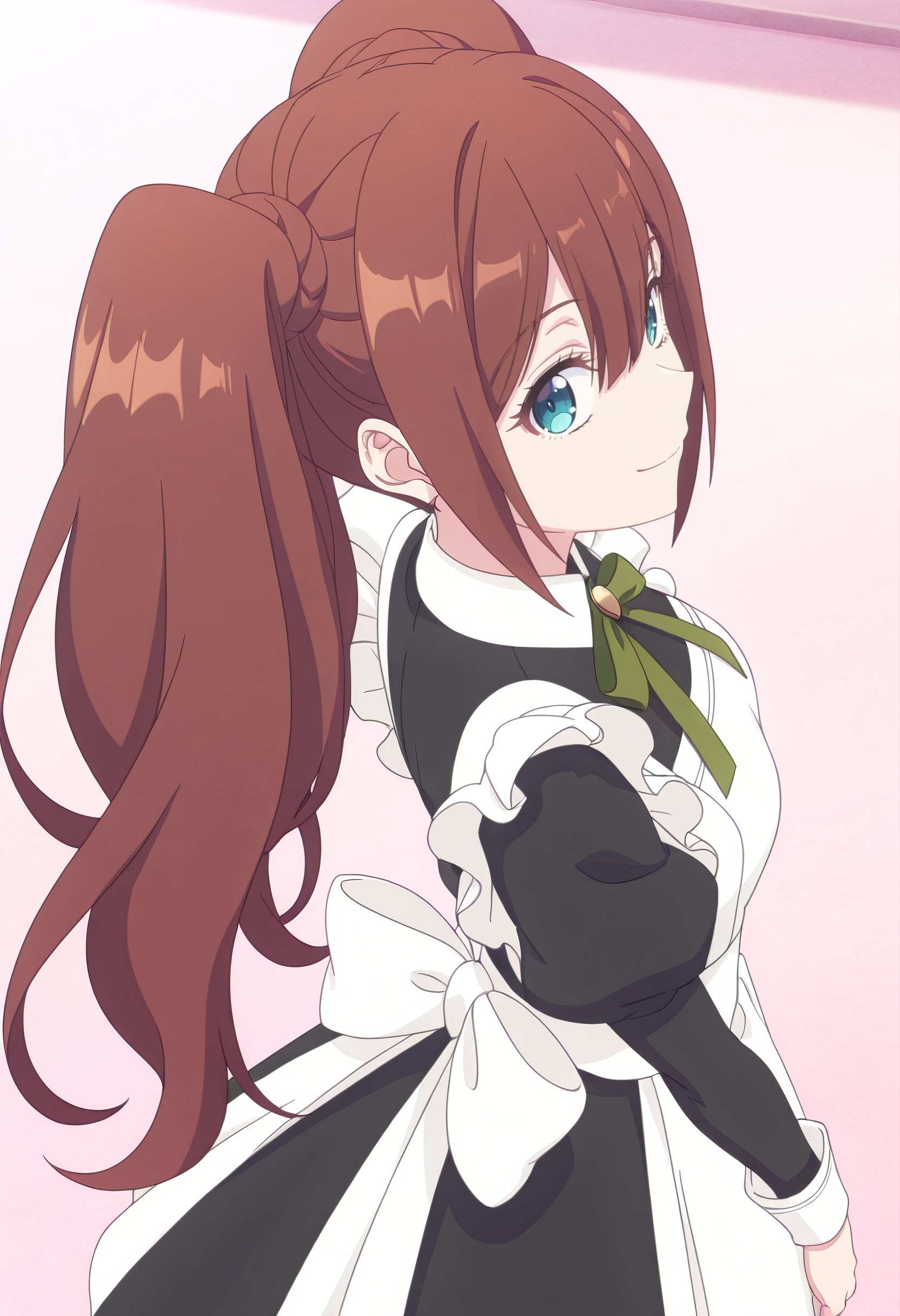 LenaOutfit, 메이드, 앞치마, 메이드 헤드기어, 메이드 앞치마, 검은 드레스, 흰 앞치마, 드레스, 프릴, 프릴이 있는 앞치마, enmaided, 리본, 녹색 리본, bows, 긴 소매, 볼륨 있는 소매, 목 리본, 줄리엣 소매, 칼라 드레스, 녹색 리본, 소매 단추, 뒤 리본