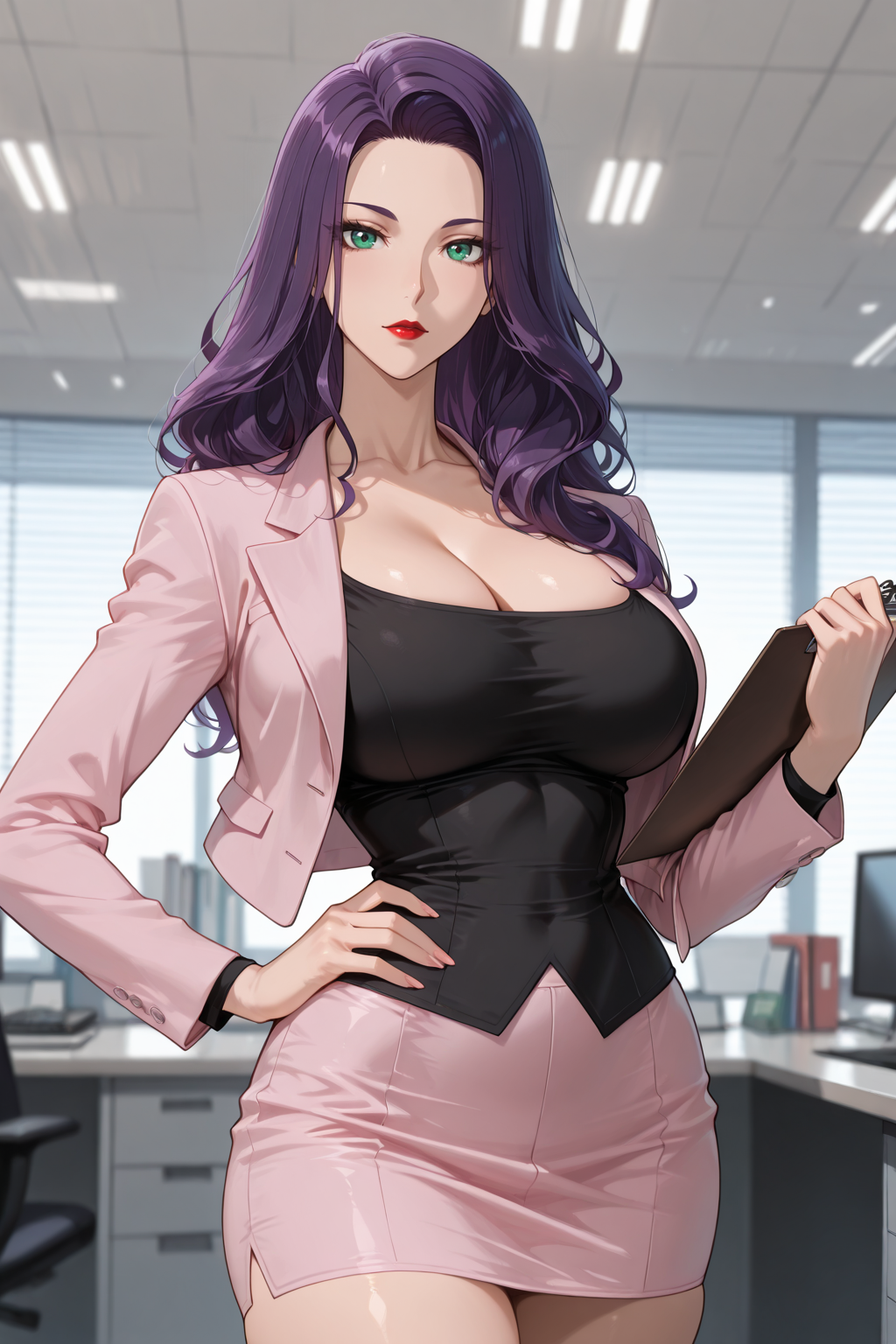 pink jacket, black undershirt, cleavage, collarbone, long sleeves, pencil skirt, miniskirt