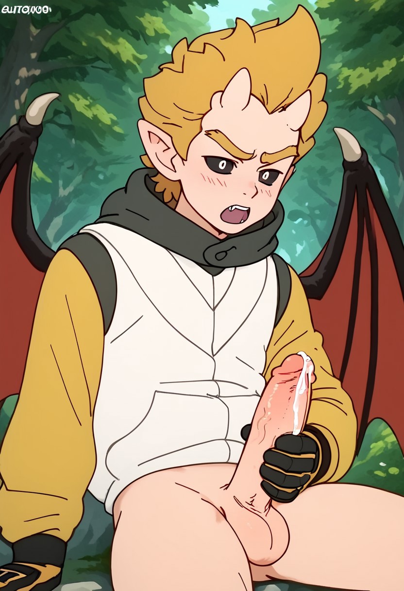 Yi, 악마 형태, 혼자, 1남자, 금발, 노란 눈, 검은 공막, 노란 홍채, 검은 동공, 뾰족한 귀, 뿔, 두꺼운 눈썹, 검정 및 빨강 날개, 노란 스웨터, 흰 조끼, 검은 후드, 검정 및 노란 장갑, 검은 바지, 노란 신발