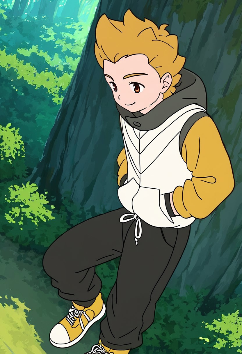 Yi, 인간 형태, 혼자, 1남자, 금발, 갈색 눈, 노란 스웨터, 흰 조끼, 검은 후ood, 검정 및 노란 장갑, 검은 바지, 노란 신발