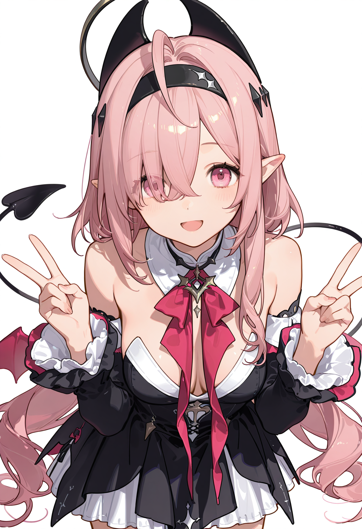 skuld (aether gazer), 1girl, solo, ahoge, frilled sleeves, frills, hair ornament, bare shoulders, very long hair, detached sleeves, pointy ears, black dress, black hairband, long sleeves, light pink hair, pink eyes, black sleeves, (hair over one eye:1.1), detached collar, medium breasts, demon tail