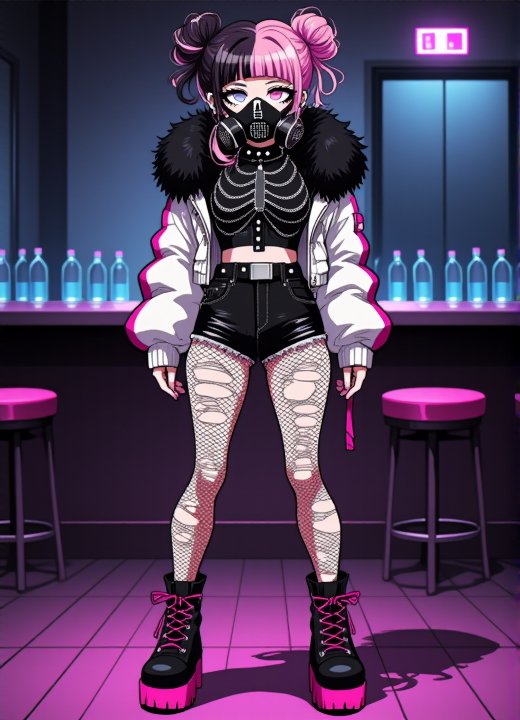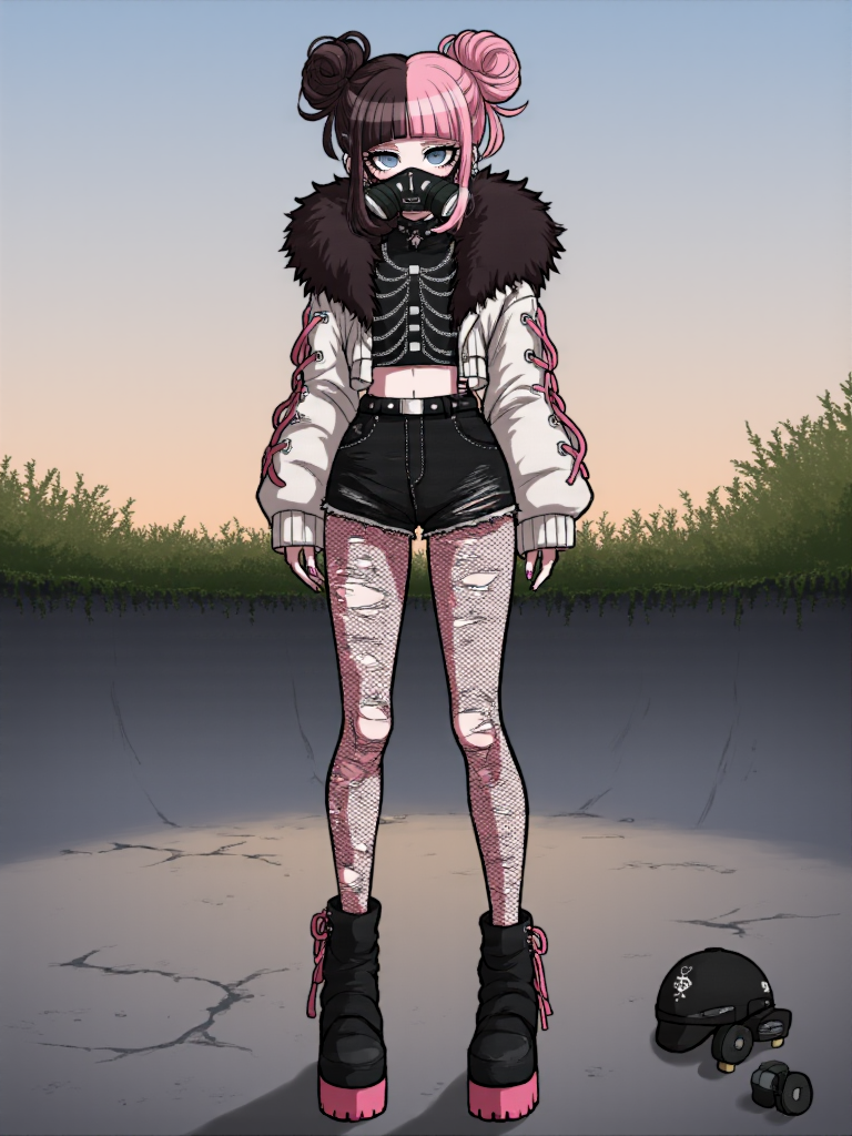 표준 복장 (설명형 + 태그): kiomi_(criis-chan), 키오미라는 여자아이의 이미지. 그녀의 머리는 오른쪽이 진한 갈색, 왼쪽이 연한 분홍색으로 이중 색상이며, 흐트러진 더블번 스타일로 끝에 떨어진 사이드록이 있다. 왼쪽 눈은 파란색, 오른쪽 눈은 연한 회색으로 이종색채를 지녔다. 그녀는 하부 얼굴을 가리는 검은 산업용 호흡기 마스크를 착용하고 있다. 옷은 가슴을 뼈대 패턴으로 감싸는 은색 체인으로 장식된 짧은 검은 상의, 큰 검은 털 장식이 있는 느슨한 연백색 재킷, 재킷 소매에는 분홍 리본으로 코르셋 스타일의 끈이 매달려 있다. 하체는 스파이크가 달린 벨트로 단단히 고정된 하이웨이스트 검은 데님 반바지이며, 다리는 큰 터짐이 있는 찢어진 피쉬넷 스타킹을 신고 있다. 발에는 분홍색 밑창과 주름진 발목 디테일이 있는 무거운 검은 플랫폼 부츠를 신고 있다. , 1girl, belt, black_belt, black_boots, brown_hair, black_shirt, black_shorts, pink_hair, boots, criis-chan, danganronpa_(series), double_bun, ear_piercing, earrings, fishnet_pantyhose, fishnets, fur-trimmed_jacket, fur_trim, grey_eyes, blue_eyes, grey_jacket, hair_bun, jacket, jewelry, long_sleeves, mask, medium_hair, midriff, multicolored_hair, original, pantyhose, piercing, respirator, shirt, shorts, torn_clothes, torn_pantyhose, two-tone_hair