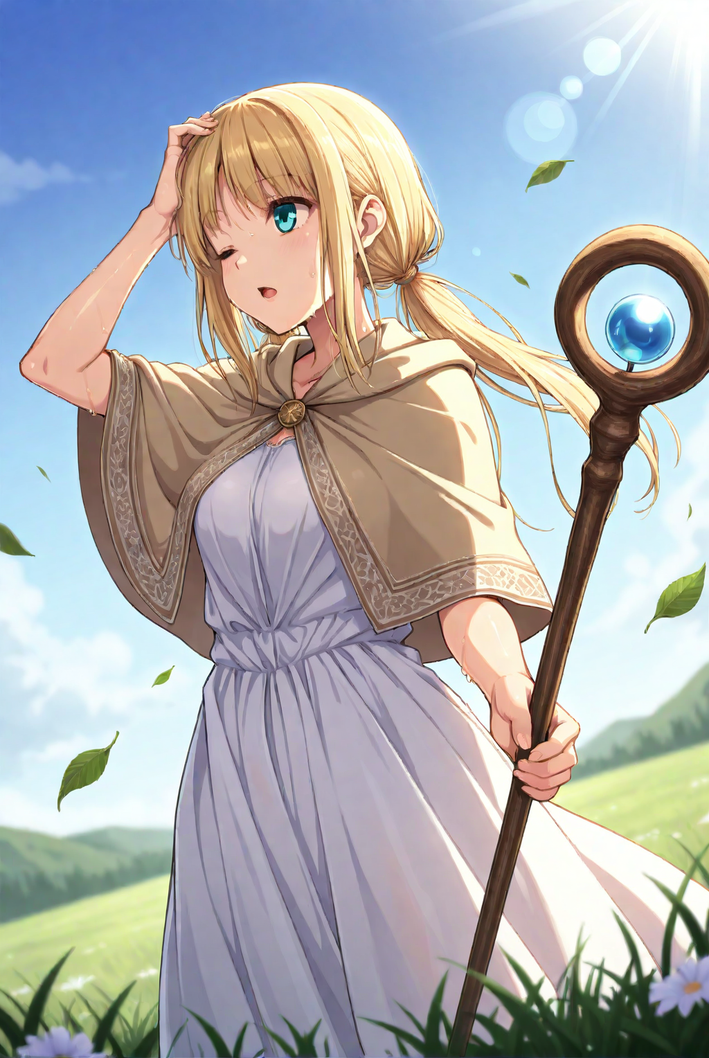 • (茶色のカペレット)、白/薄黄色のドレス、花、ノースリーブ;
