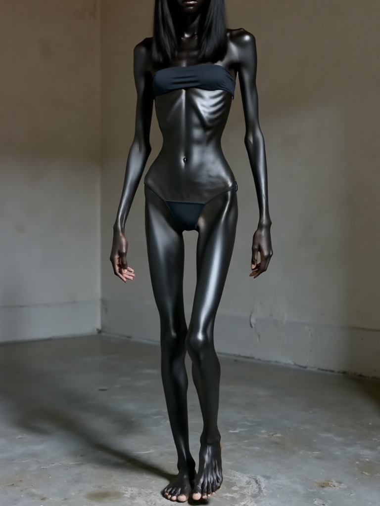 (An extremely detailed and realistic portrait of a black girl character captured from head to kneeappearing extremely thin and emaciated). (“A surreal photograph shot with a full-frame DSLR under natural light. Captures skin textureporesand imperfections vividly with cinematic realism.” Fluxreal FaceFluxreal Posenatural skin texturestudio lighting)Solo1 girl Long hair Direct gaze Belly button Monochrome Upper body Grayscale Abdomen Lips Realistic Tube top Short hair Belly button Nipples Full body Nude Outdoors Bare feet Vagina Daytime Shadows Sea Beach Realistic Ribs (Realistic 3D body proportionsSurreal photographyPerfect realismHighest quality8K32KMasterpieceVividnessUHD:1.2)