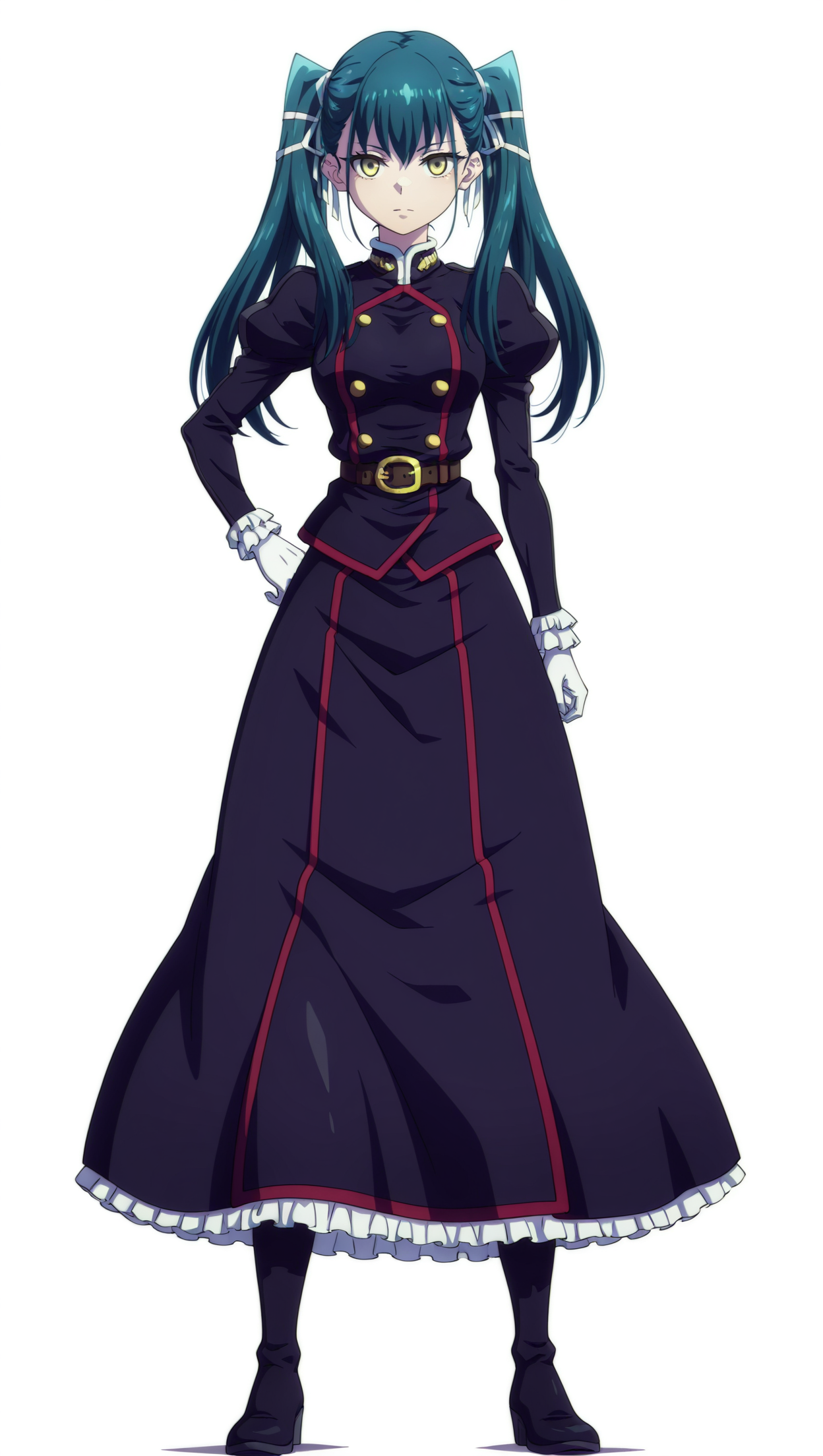 anime coloring, masterpiece, best quality, amazing quality, 4zum4y4ch1h0, 1girl, long hair, twintails, blue hair, yellow eyes, medium breasts, hair ribbon, white ribbon, military uniform, black uniform, gloves, white gloves, belt, long skirt, black skirt, frills, boots, black footwear, solo, pose, standing, looking at viewer, from front, ((((white background, simple background))))