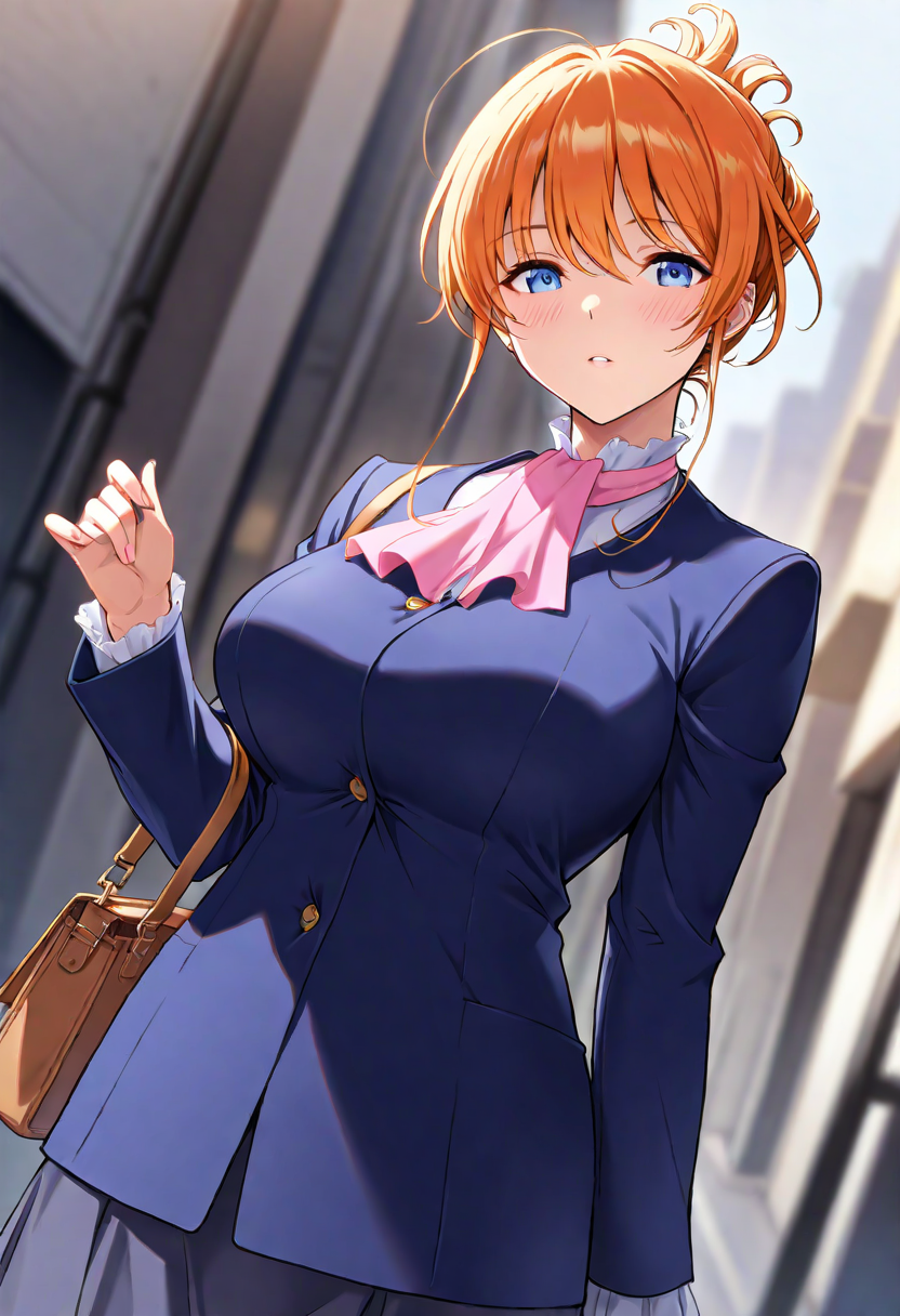 • 髪を結んだ状態、白いシャツ、フリル、ピンクのネクチーフ、青いスーツ ;