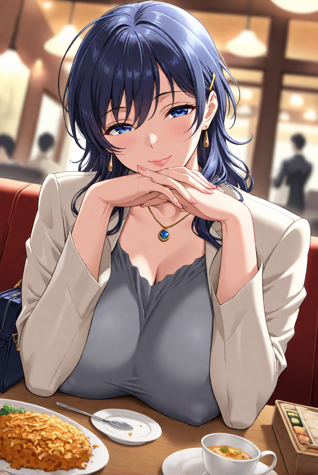 • ネックレス、グレーのシャツ、(薄い)ベージュのジャケット、赤いペンシルスカート ;