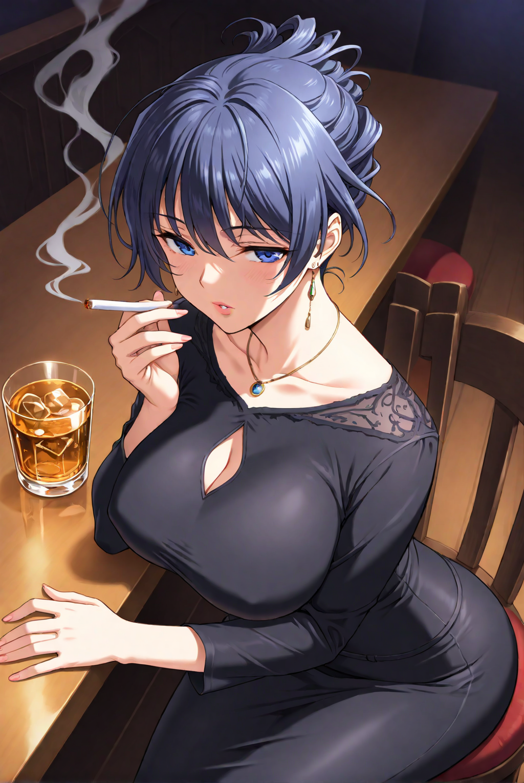 • 髪を結んだ状態、イヤリング、レースのトリム、黒いドレス、ぴったりした服、ブレスレット、指輪、ベルト、ペンシルスカート ;