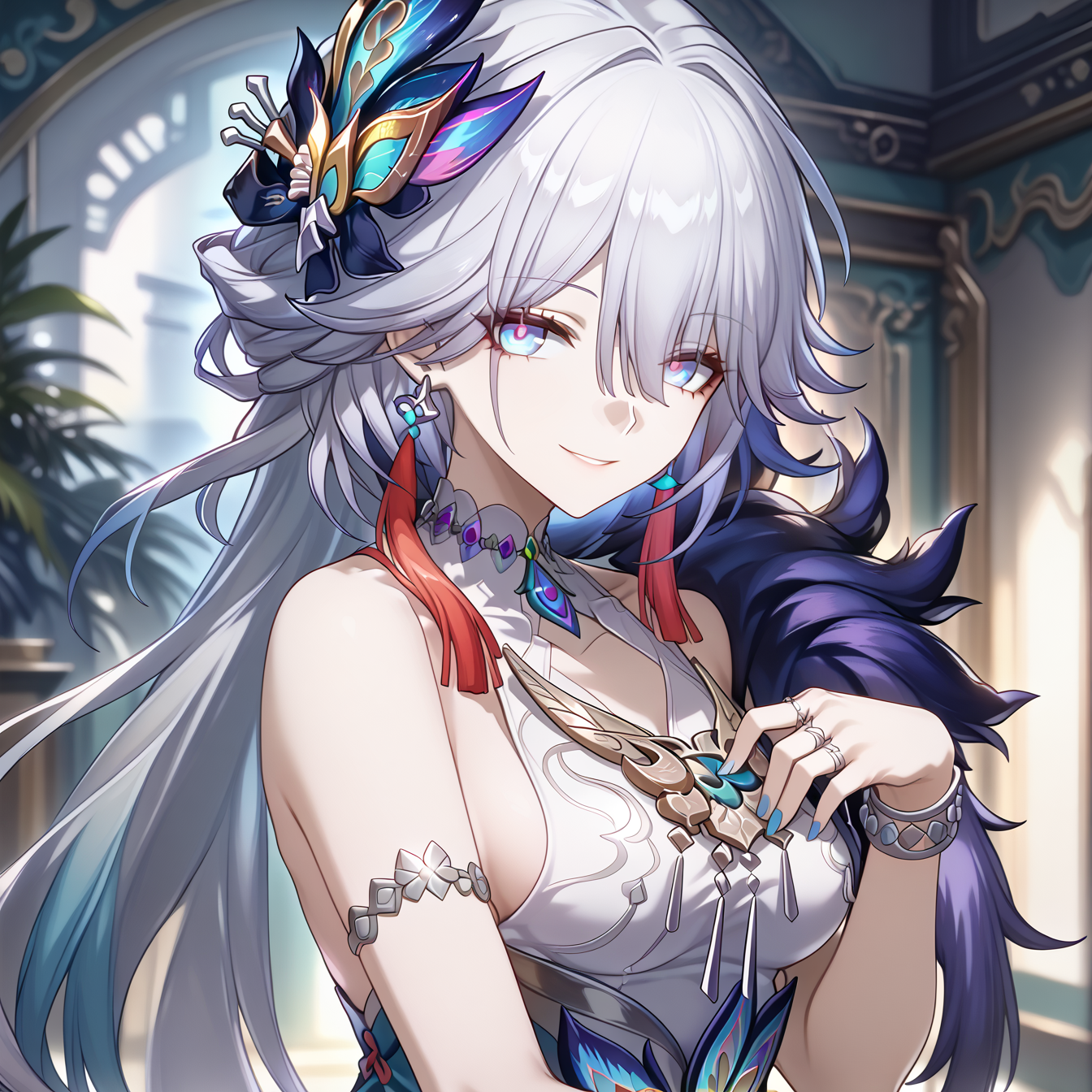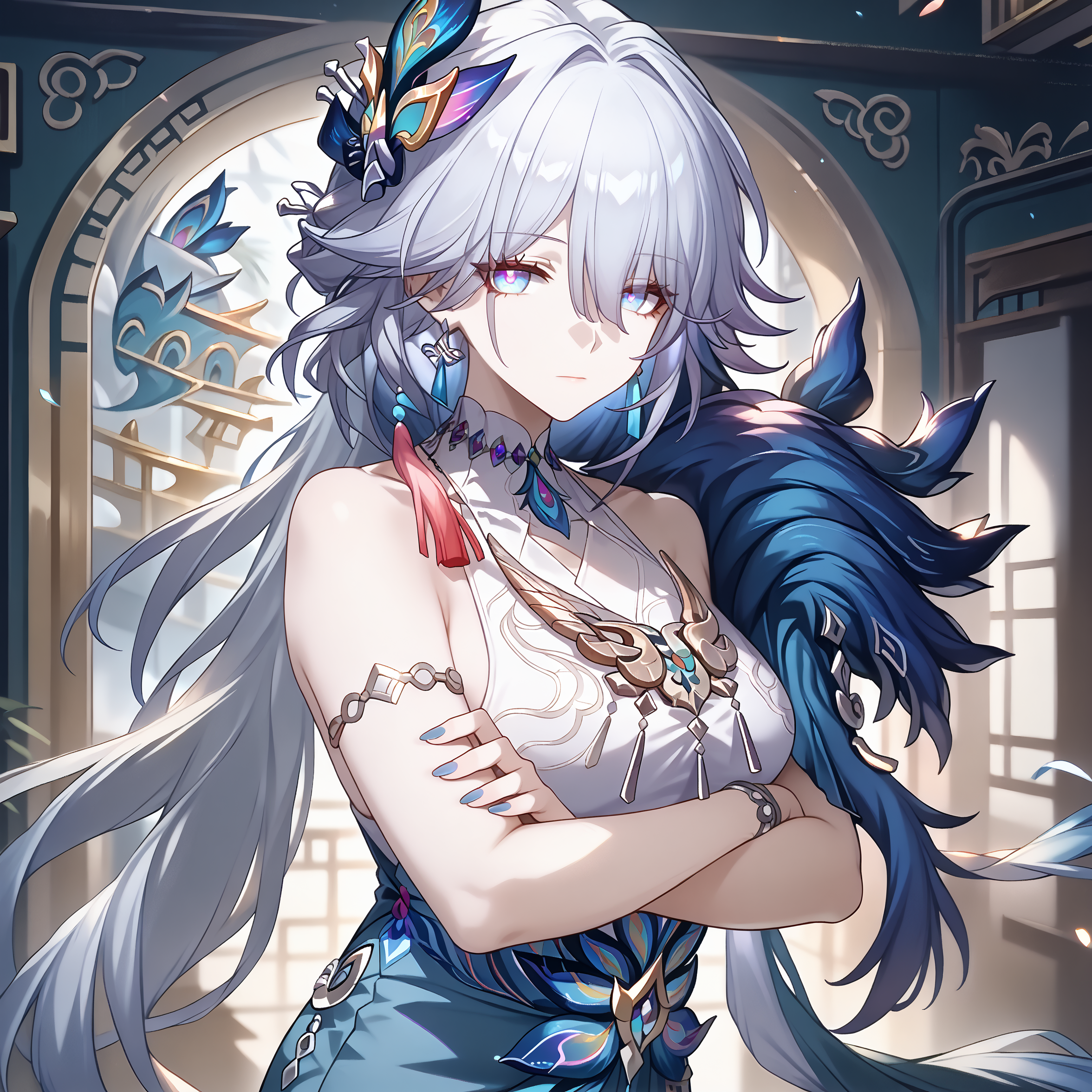 score_9, score_8_up, score_7_up, source_anime, masterpiece, best quality, newest, absurdres, highres, Yaoguang, 1girl, (solo:1.3), adult, mature, tall, hair ornament, long hair, bracelet, dress, bare shoulders, feather, smile, looking at viewer, blue nail polish, elegant, ladylike,