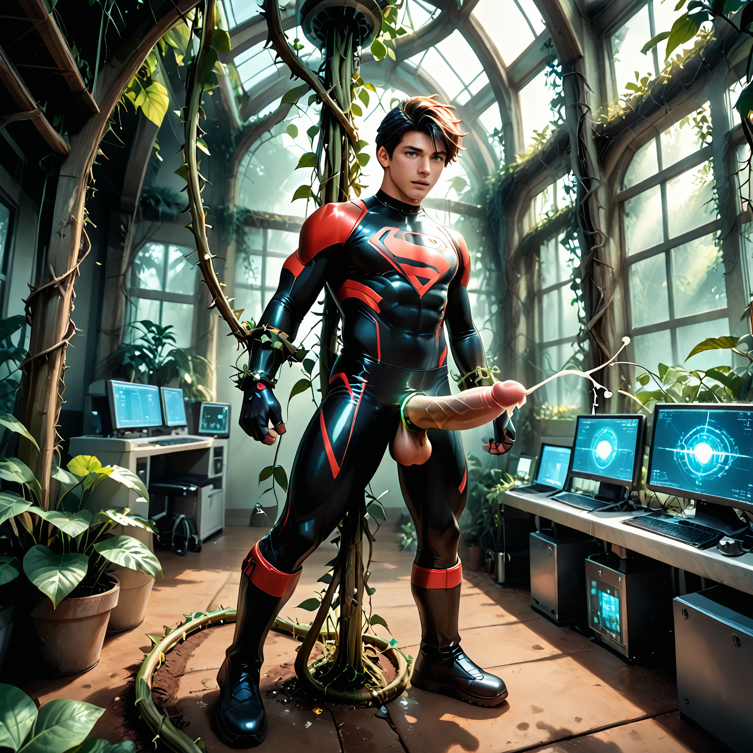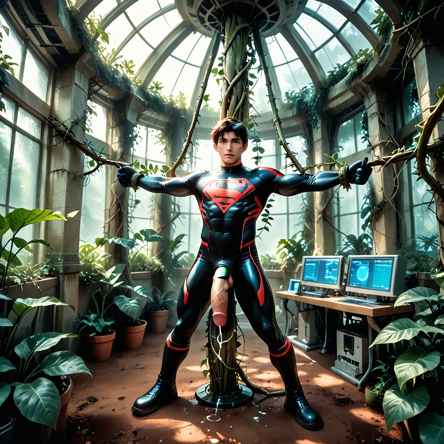 想象一下:一座巨大的潮湿温室中,狂野扭曲的藤蔓疯狂蔓延 🌀🍃,粗壮如怪物般的触须无处不在 🌿💪,而在这片混乱中心,身着闪亮黑色紧身衣的无面男子 😶🌫️🖤 被彻底征服:被紧紧缠绕 ⛓️,高高吊起 ✈️,无助地悬空,被强韧的藤蔓层层包裹、蚕食 😈🔥!