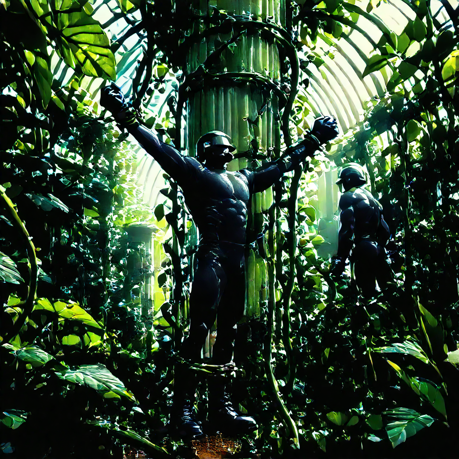 触发词:“荒芜温室恐怖、粗壮藤蔓缠绕无面男子、黑色紧身衣被藤蔓悬吊、黑暗植物噩梦”