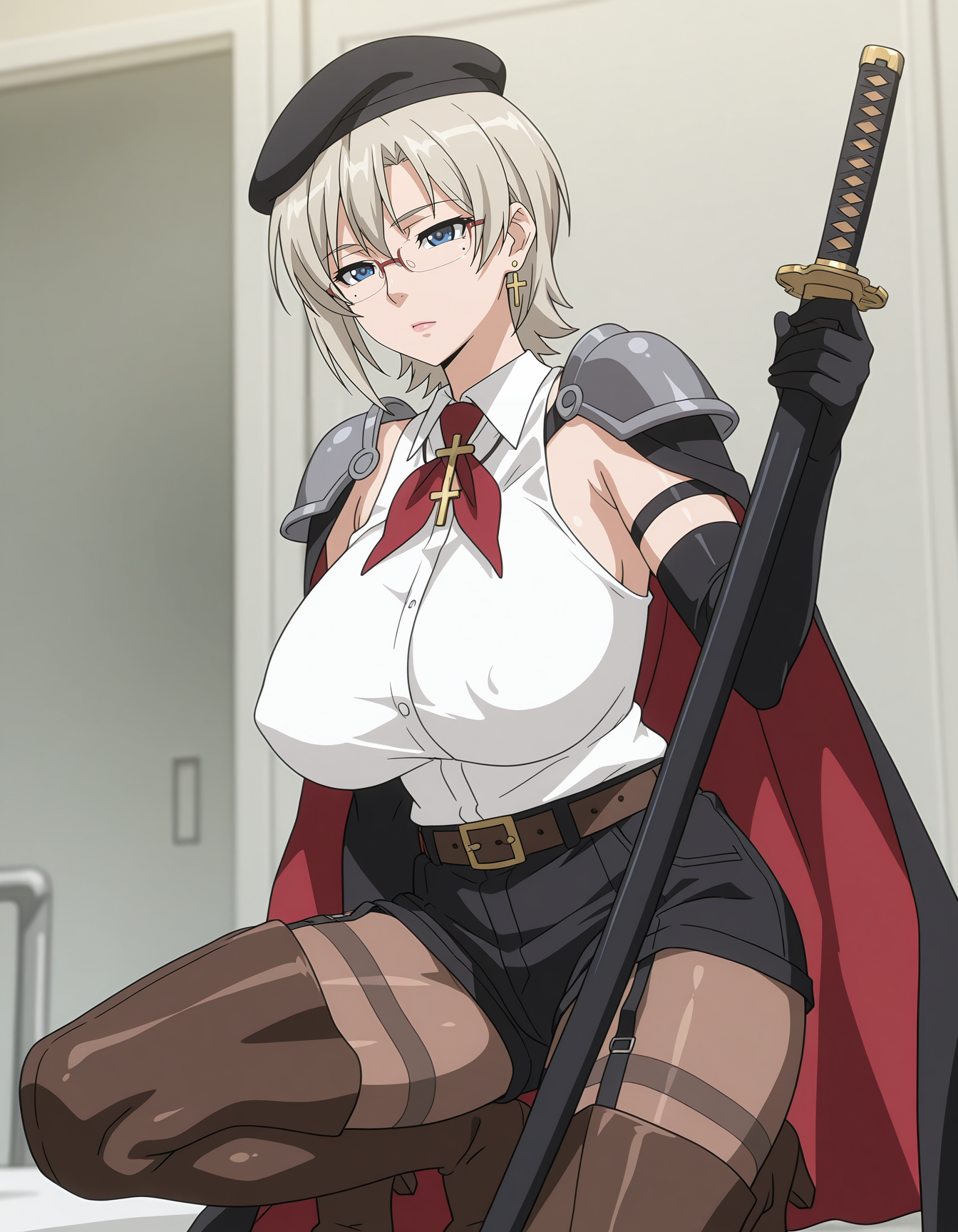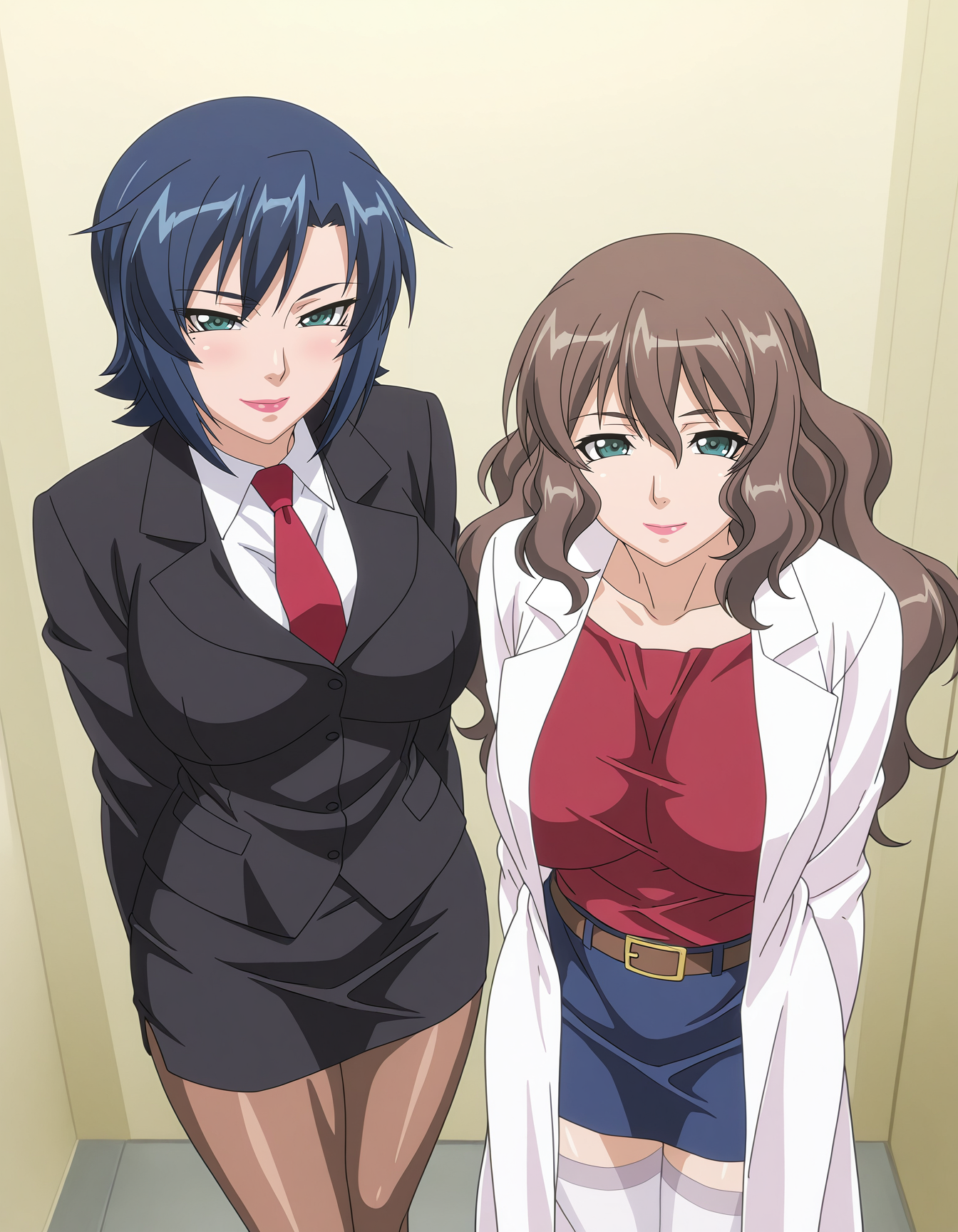 mai_gcsa,mai_hazukigc,long_hair,brown_hair,blue_eyes,pink_lips,large_breasts,lab_coat,red_shirt,belt,blue_pencil_skirt,white_thighhighs,white_sandals