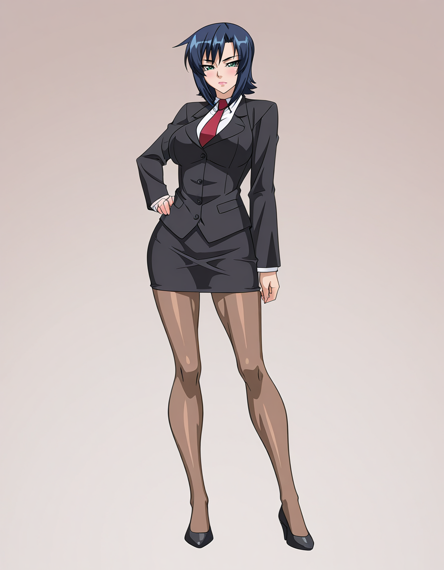 mai_gcsa,mai_rinnegc,short_hair,blue_hair,green_eyes,pink_lips,black_suit,write_shirt,red_necktie,pencil_skirt,black_pantyhose,high_heels