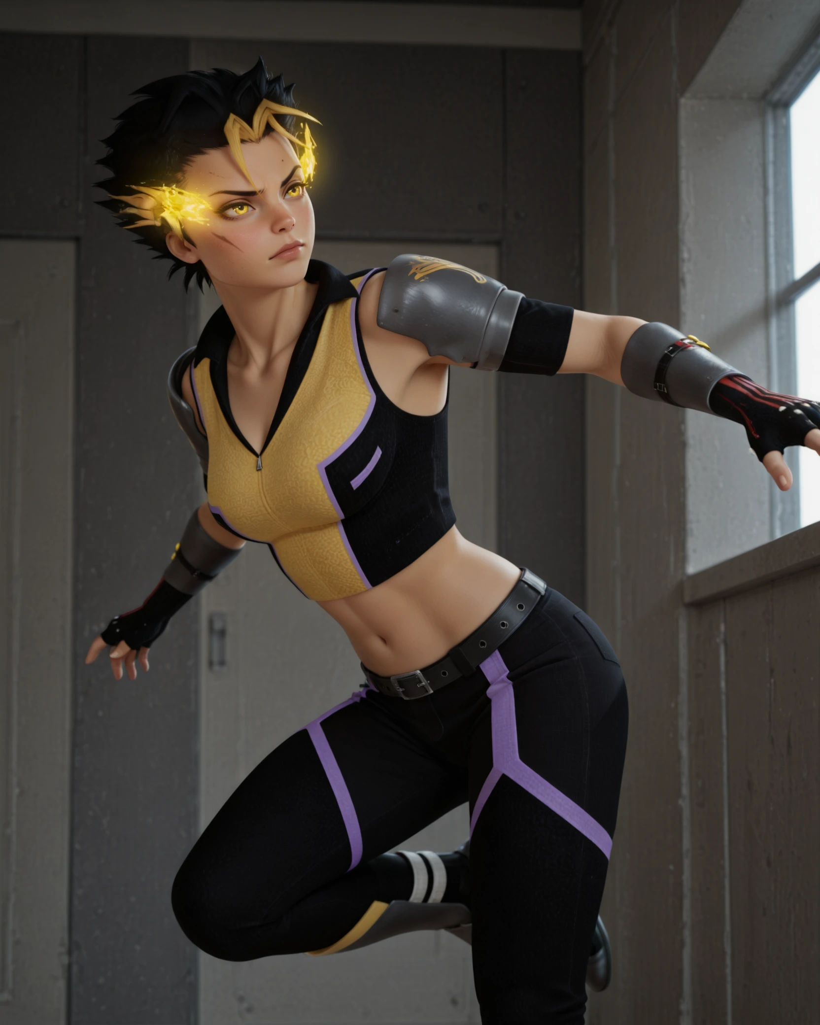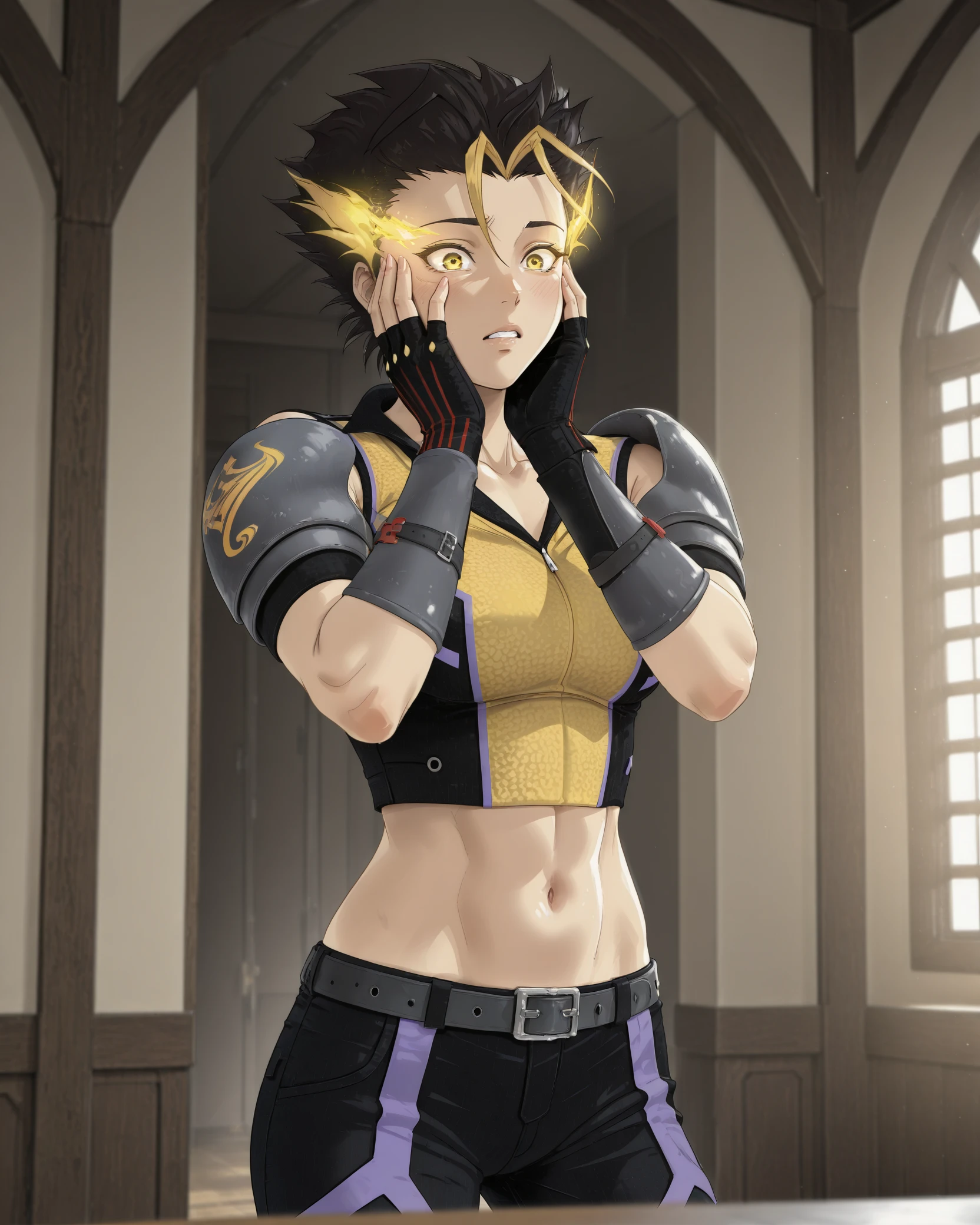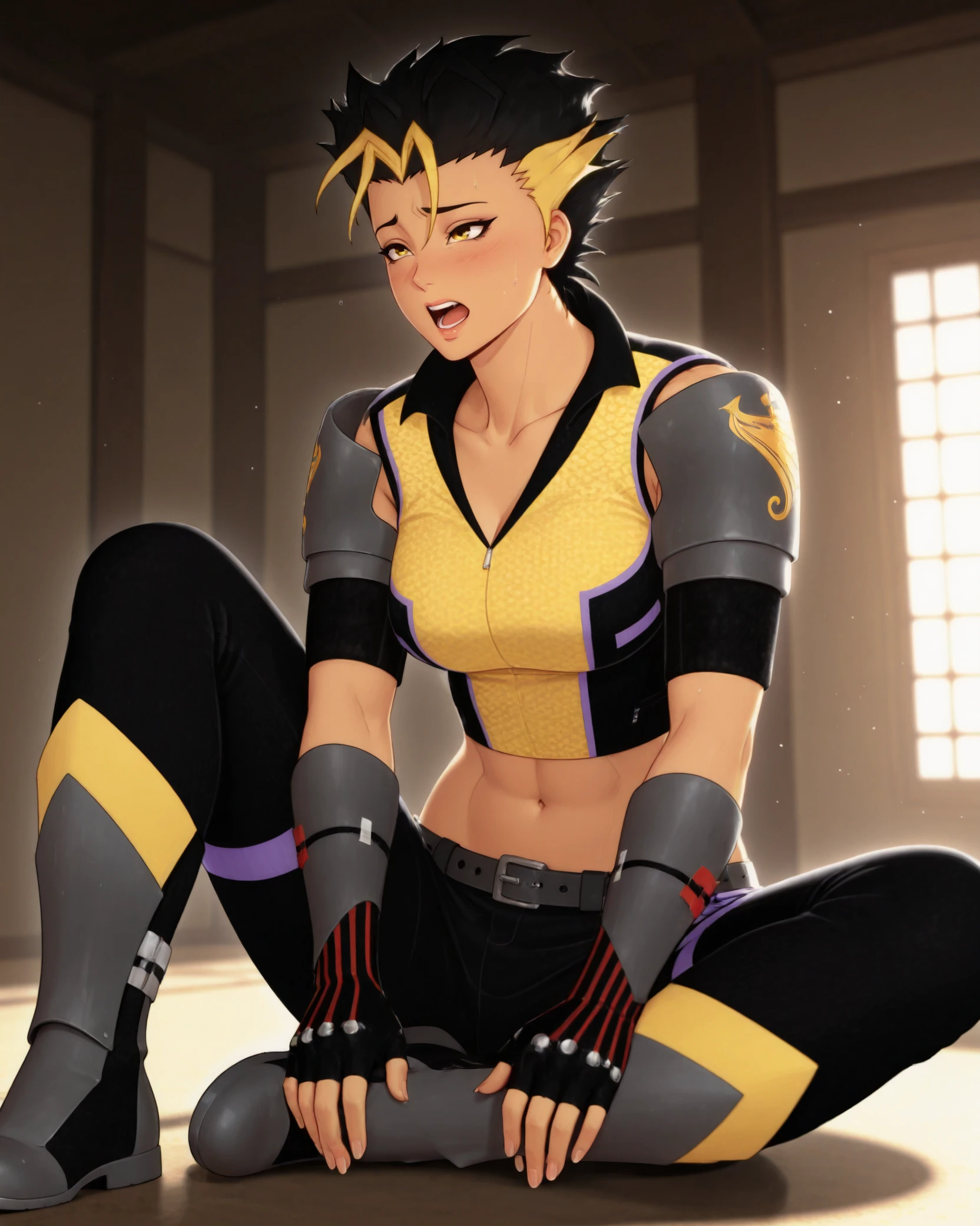 衣装: スカーフ、ノースリーブ、指なし手袋、黒い手袋、ブーツ、黒い靴