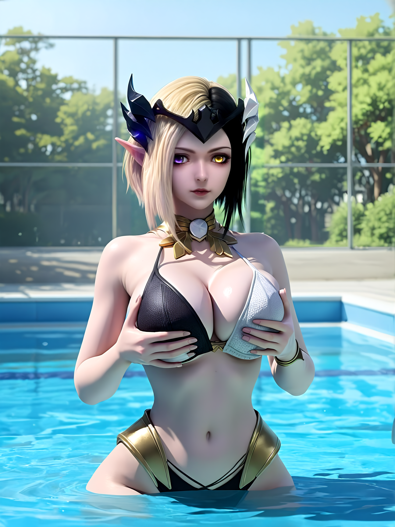 ADETAILER 프롬프트: lora:lunox_def_mlbb_IL:1 자세한 얼굴, 사실적, 이색성 동공, 이색 머리카락, 머리 장식, 헤어밴드, 노란 눈, 보라색 눈, 뾰족한 귀, 금발, 검은 머리