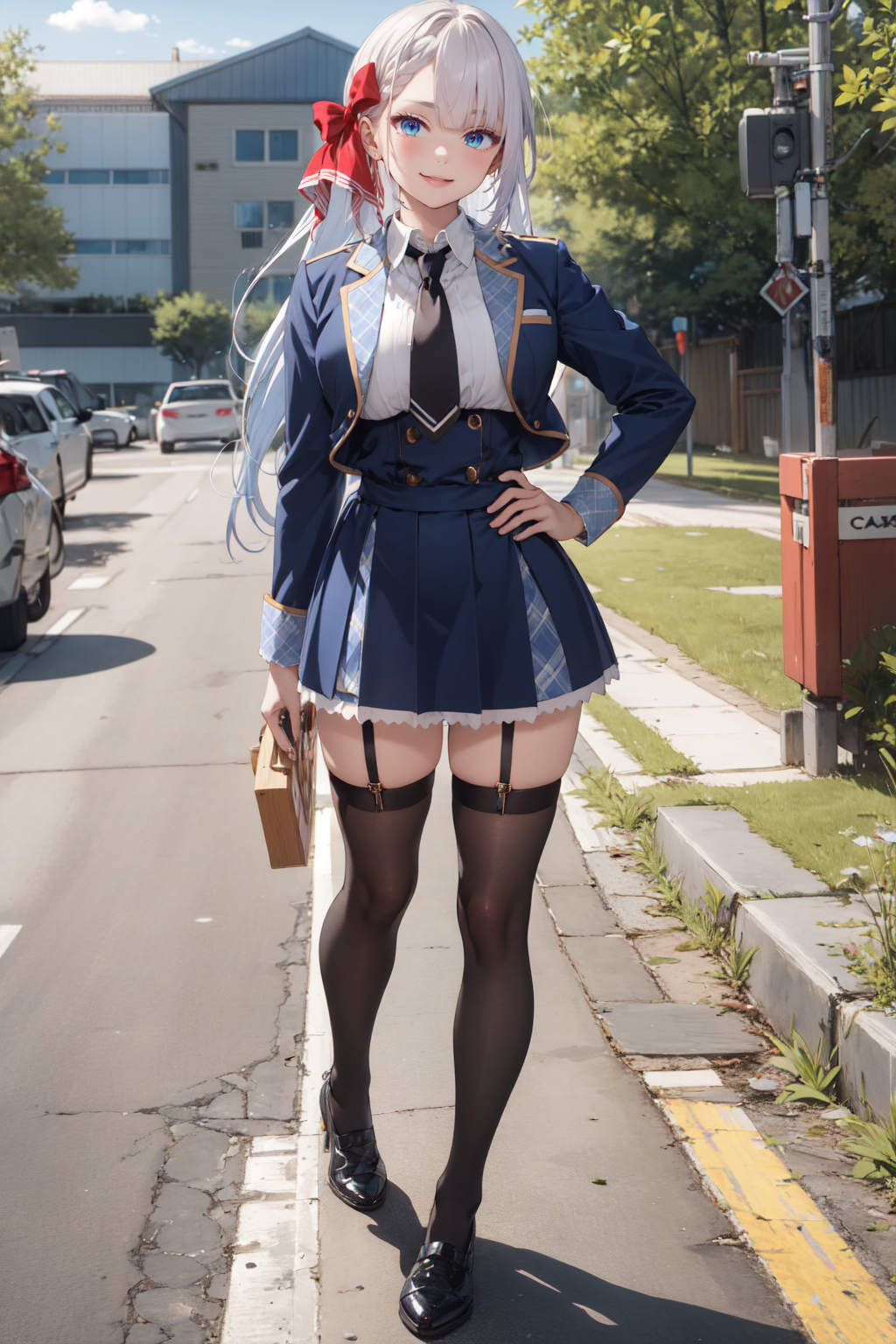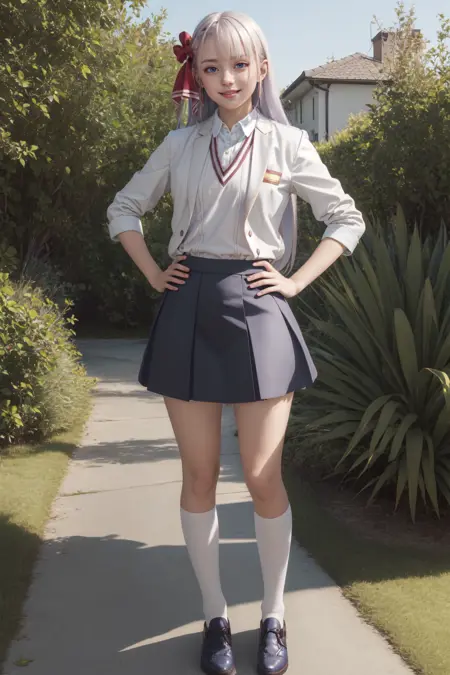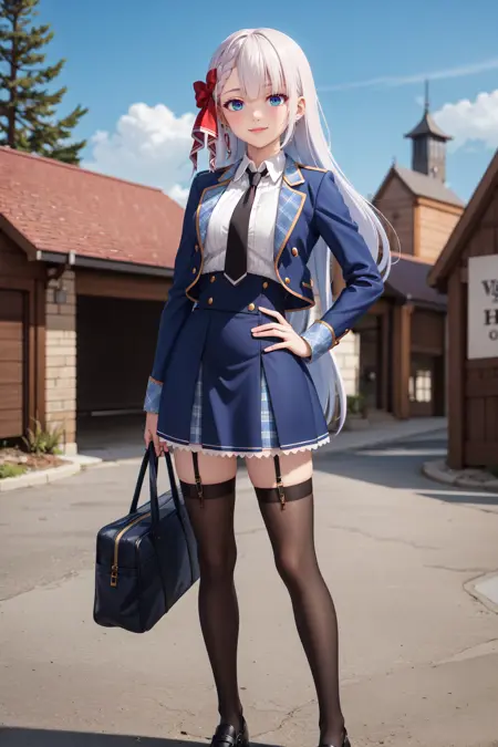 衣装:白シャツ、青ジャケット、カーラー付きシャツ、青スカート、黒ネクタイ、学園制服、黒靴、黒タイツ、タイツストラップ