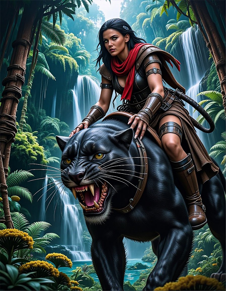 badmilk この画像は、ファンタジー芸術スタイルの詳細で、非常に詳細なデジタルドローイングです。騎士とドラゴンの壮絶な戦いの場面を描いています。左側の騎士は、中世風のプレートアーマーを着用し、剣を高く掲げています。ヘルメットをかぶり、風に揺れるマントを身にまとっています。マントは複雑な渦巻き模様で描かれ、動きを表現しています。騎士のアーマーは、リアルな金属の光沢で描写されており、足取りは一歩を踏み出そうとしている姿勢で、攻撃の準備をしています。