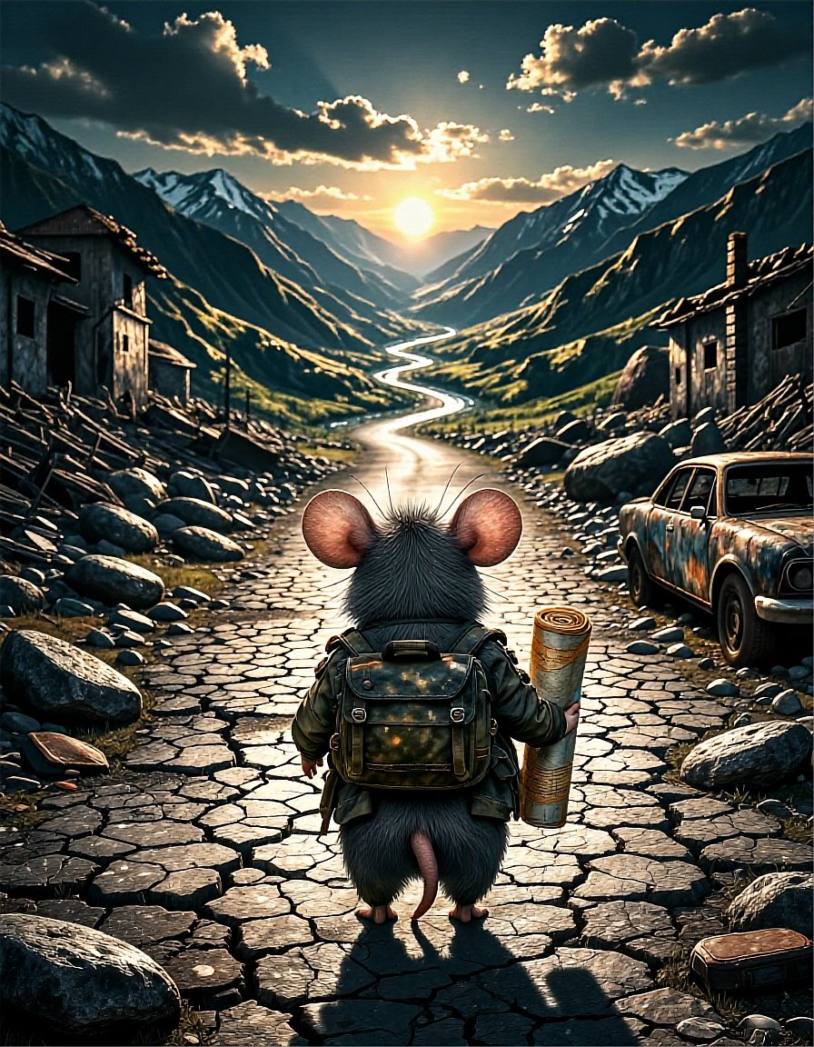 背景には、暗く不気味な雲と崩壊した都市の風景が広がっています。空は渦巻くドラマチックな雲で満たされ、地面は荒れた岩場で、ほの暗く燃えている火と崩れかけた石造りの建造物が散らばり、破壊と混沌の感覚を強調しています。全体の色調は。