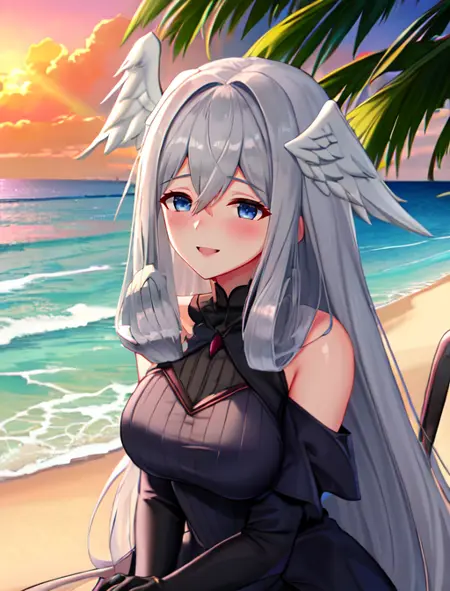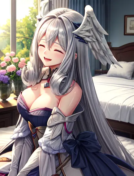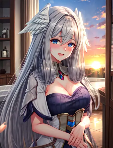 추가로 도움이 될 수 있는 단어: 파란 눈, 머리 날개, 눈 사이의 머리카락, 회색 머리, 긴 머리