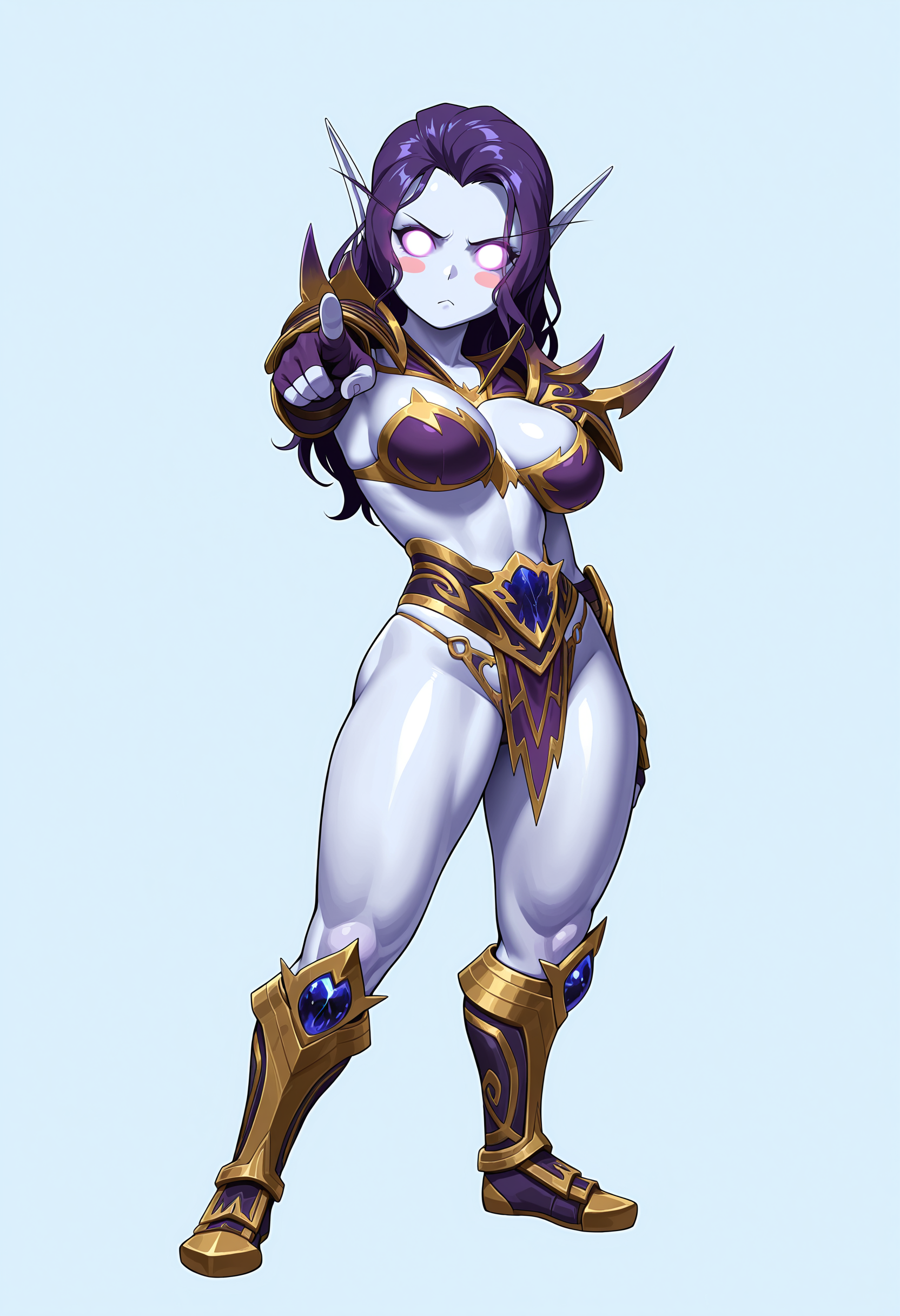 • lucrilf、紫髪、紫目、実心の目、尖った耳、ビキニアーマー、骨盤カーテン