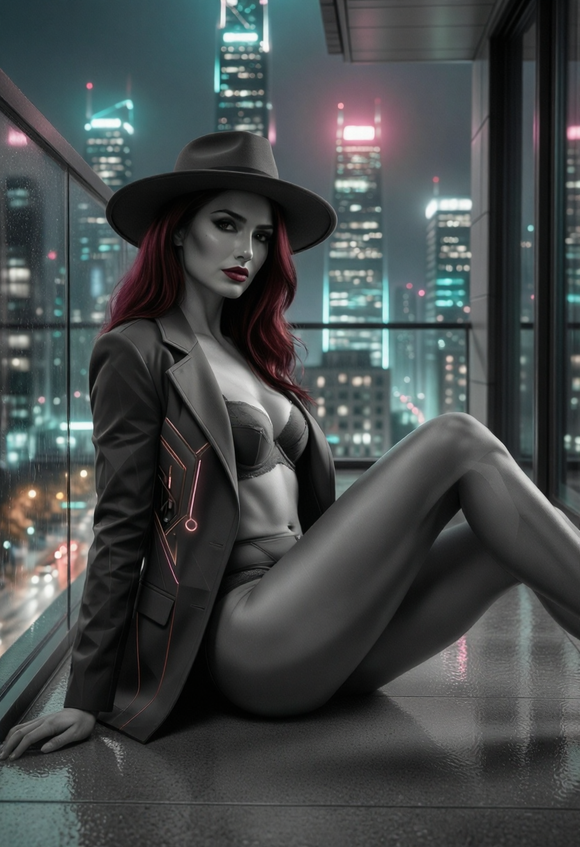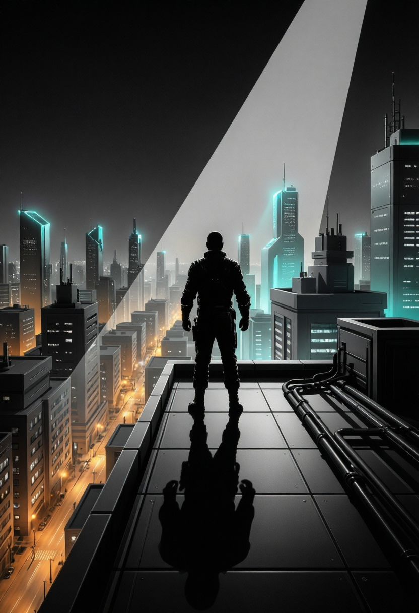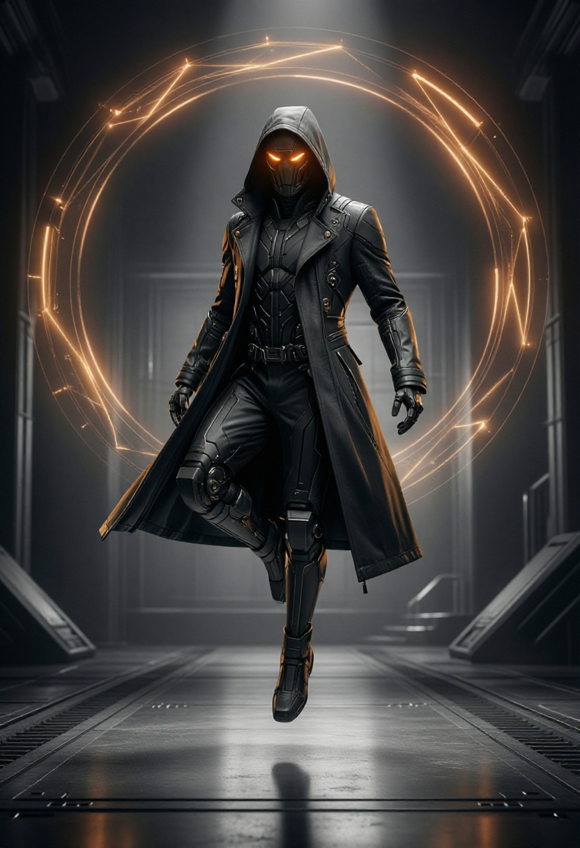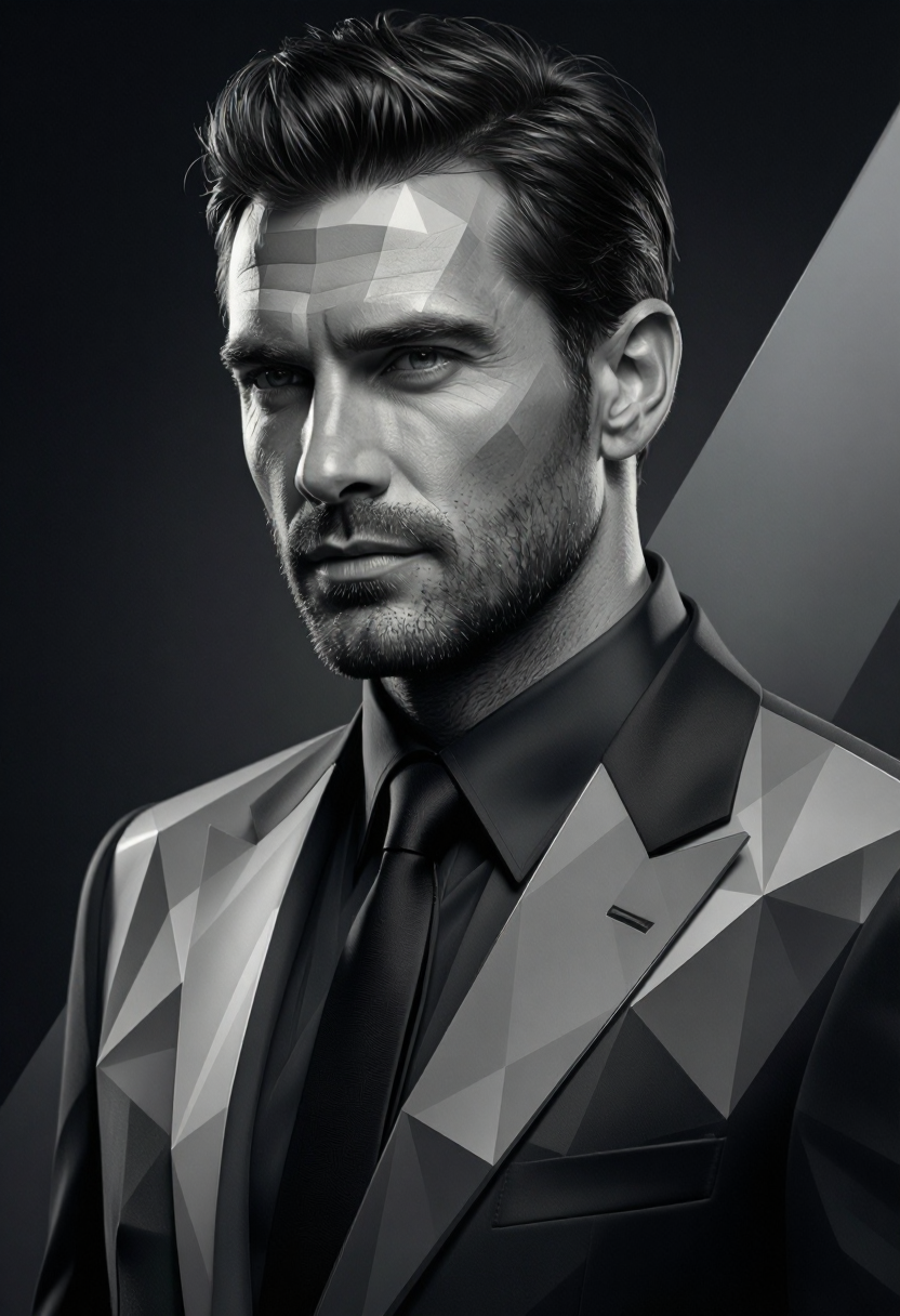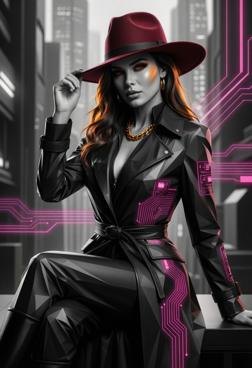 モノクロ、角形シェーディング、ファセット幾何学、グラフィックリアリズム、クリーンな幾何学的平面、鋭いシルエット、彫刻的表面、高コントラスト照明、映画的ノワール照明、控えめなサイバーパンク、未来型素材、埋め込み型テクノロジー設計、マットレザー、ブラシ仕上げの金属、磨かれた鋼、制御された色のアクセント、ターコイズアクセント照明、控えめなマゼンタの輝き、自信のある姿勢、優雅なシルエット、現代的な都市シーン