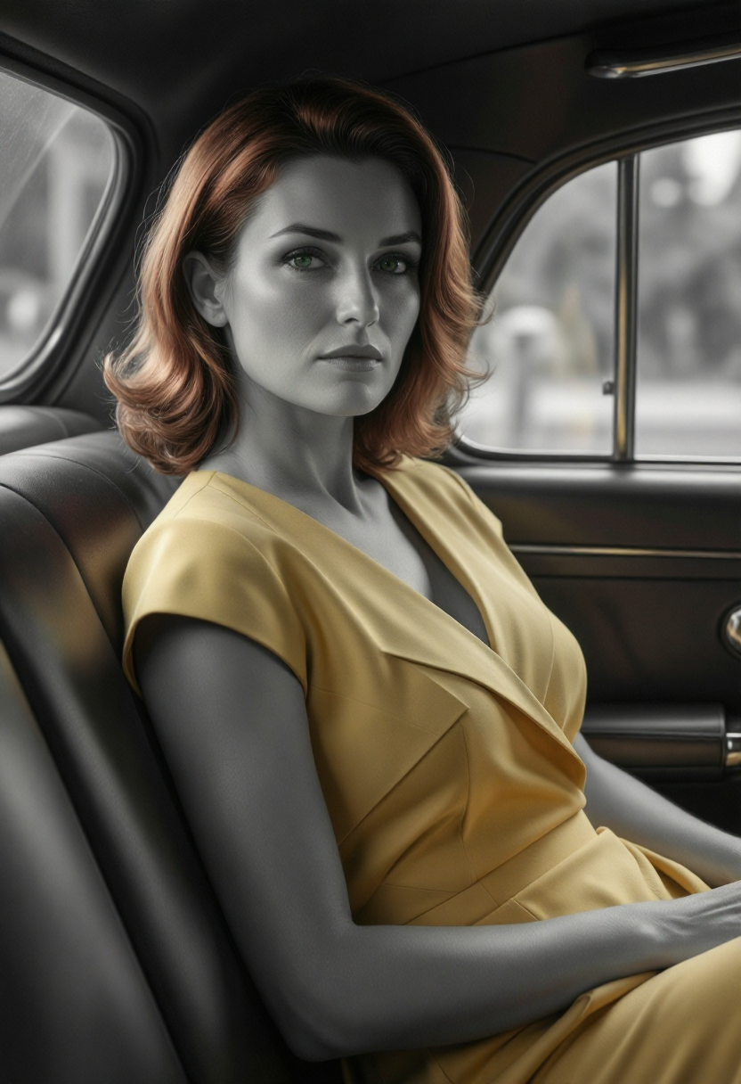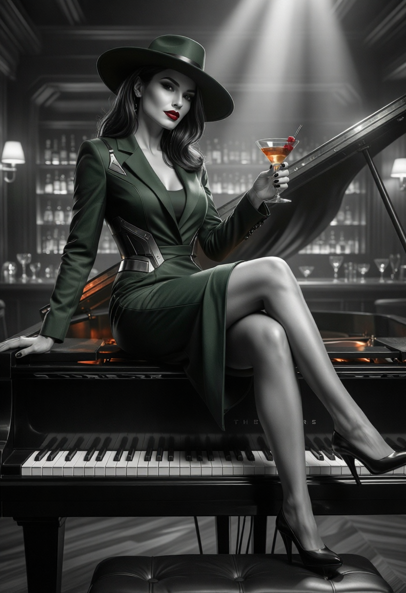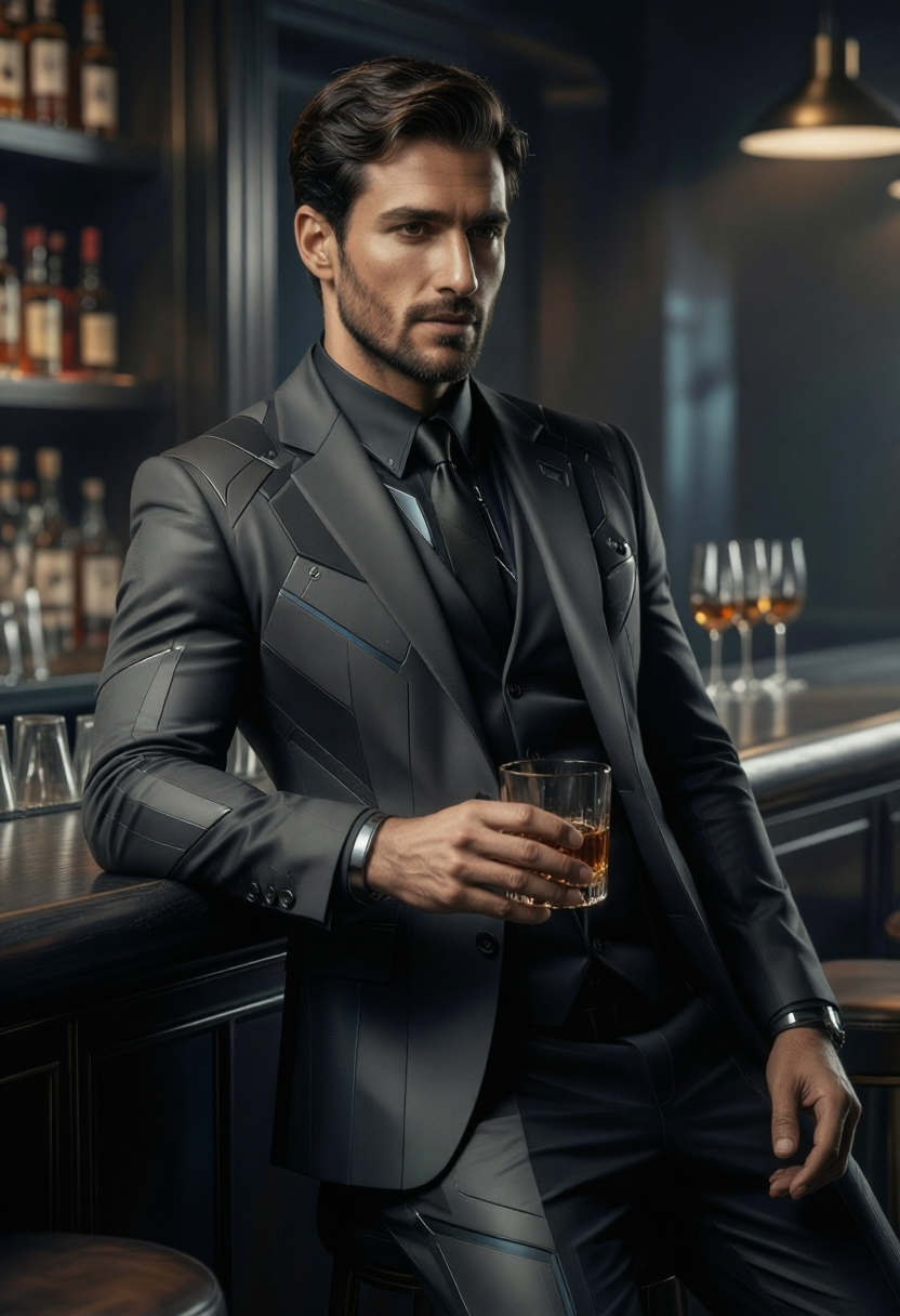 顔は滑らかな幾何学的遷移によって彫り出されます。体はテクスチャのノイズではなく、明確なフォーム言語で定義されます。衣装、建築、テクノロジーは、設計的・構造的・意図的な印象を与えます。シーンは、映画的なノワールの雰囲気と控えめなサイバーパンク的未来主義を組み合わせ、優雅さと緊張感をバランスさせます。