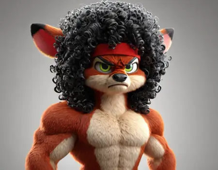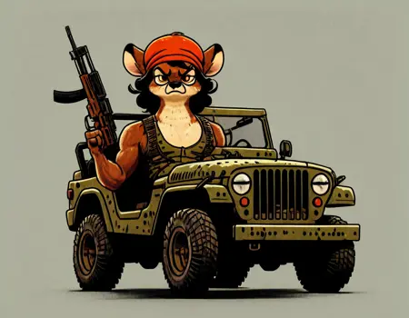 >>「Rambi」:Bambiを武装したマスクルなラムボー風アニメーションキャラクターとして再構成。赤いヘッドバンド、ジェリーカール、険しく無表情。全身ショット。<<