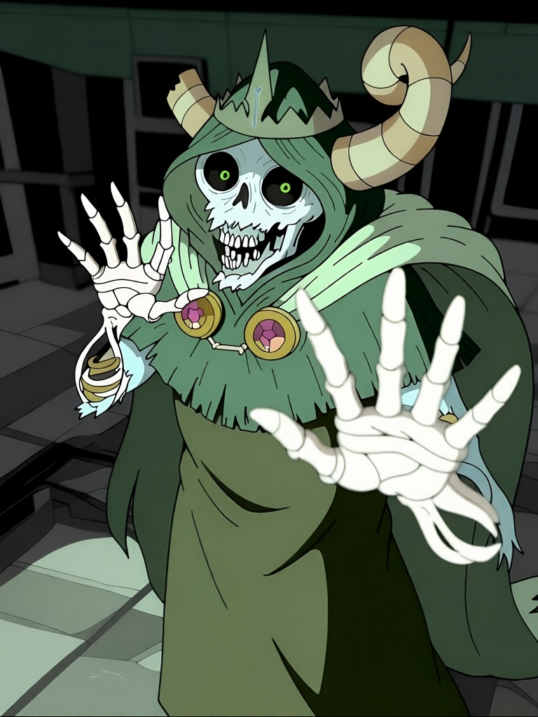 복장 착용: the_lich, 뼈대, 두개골, 뿔, 곡선 뿔, 왕관, 보석이 박힌 왕관, 로브, 녹색 로브, 망토, 겉옷, 뼈대 손, 핀, 보석, 단독