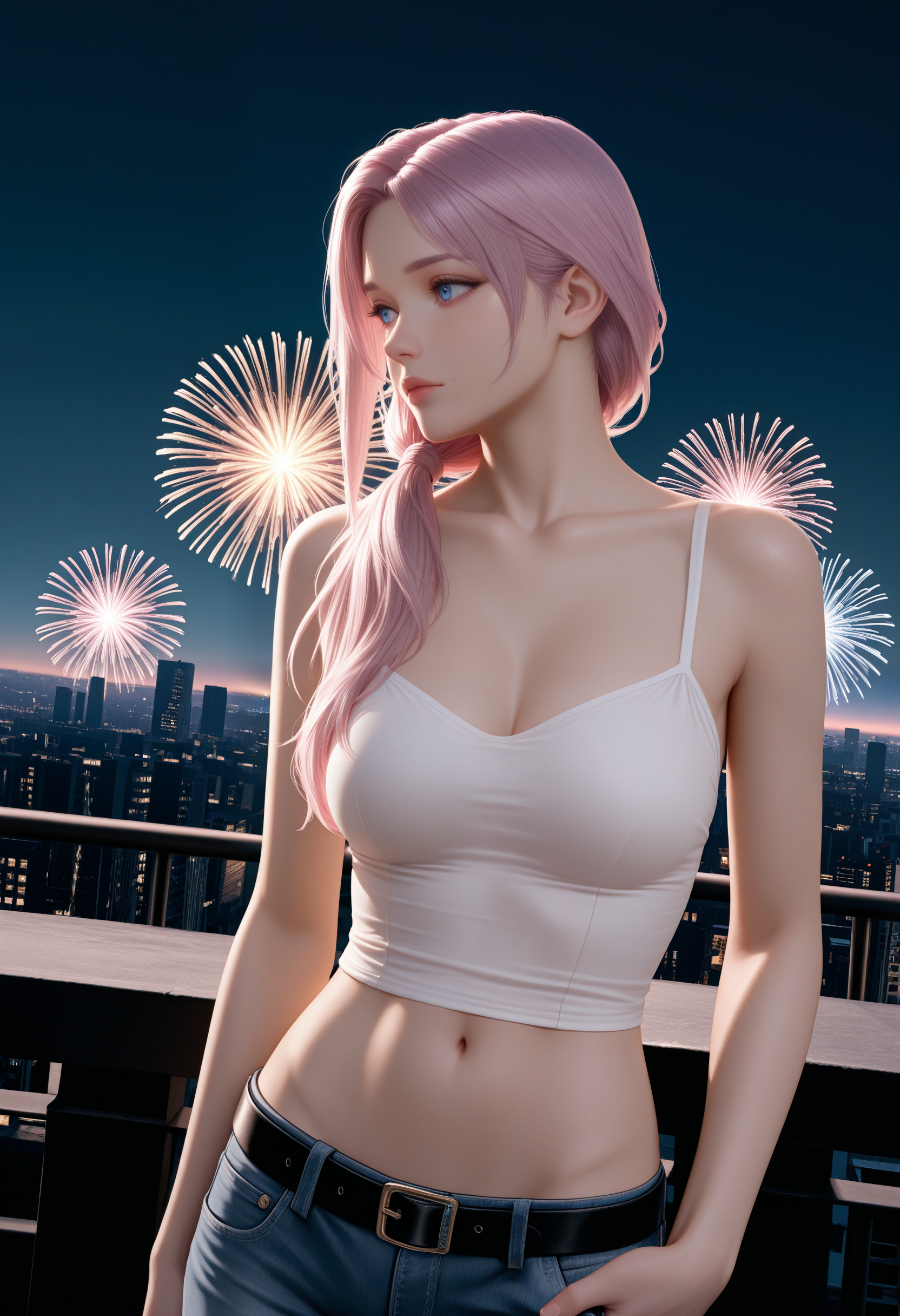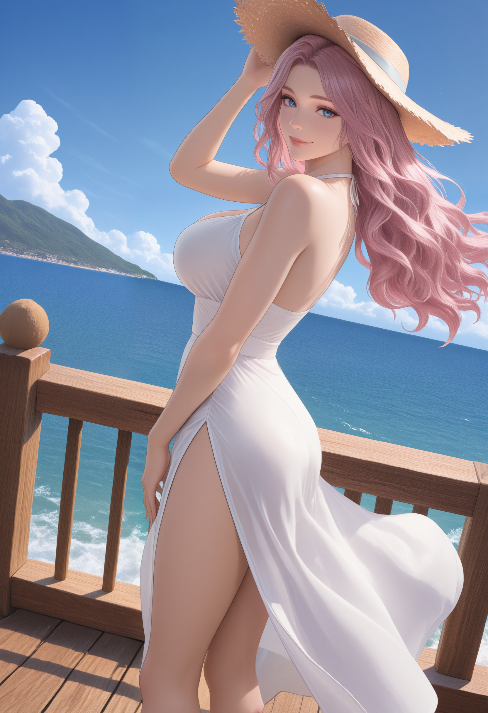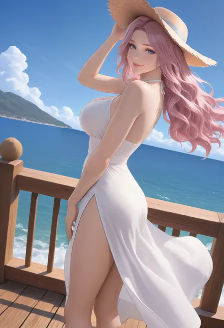 - ロングヘア:"EliseDoaxvv,blue eyes,pink hair,parted hair,long hair,wavy hair,hair down"