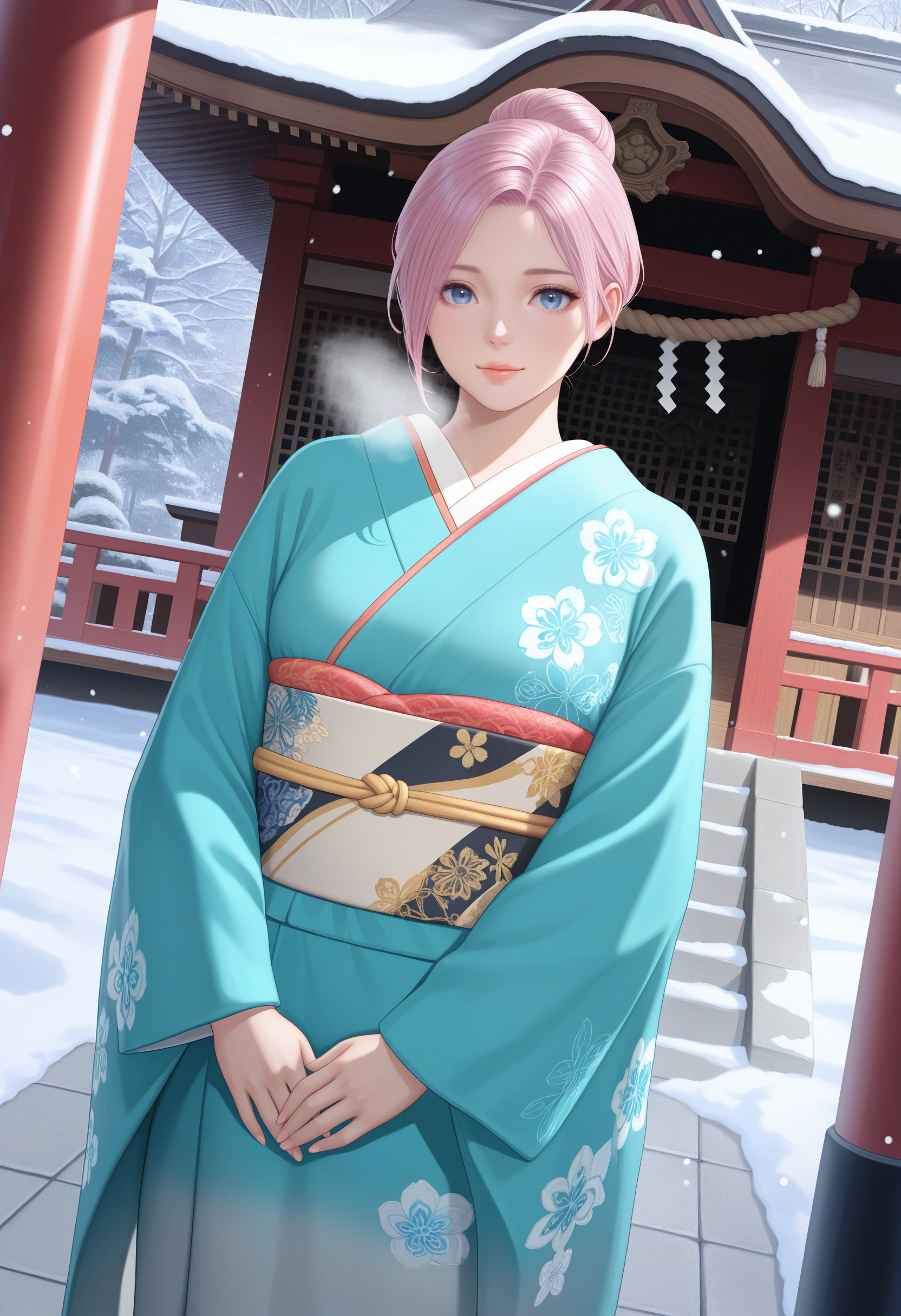 - ヘアバン:"EliseDoaxvv,blue eyes,pink hair,parted hair,single hair bun,short hair"