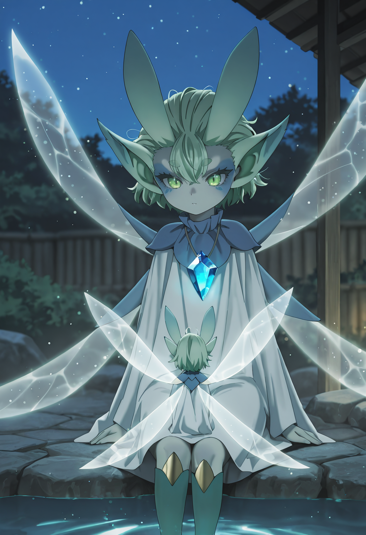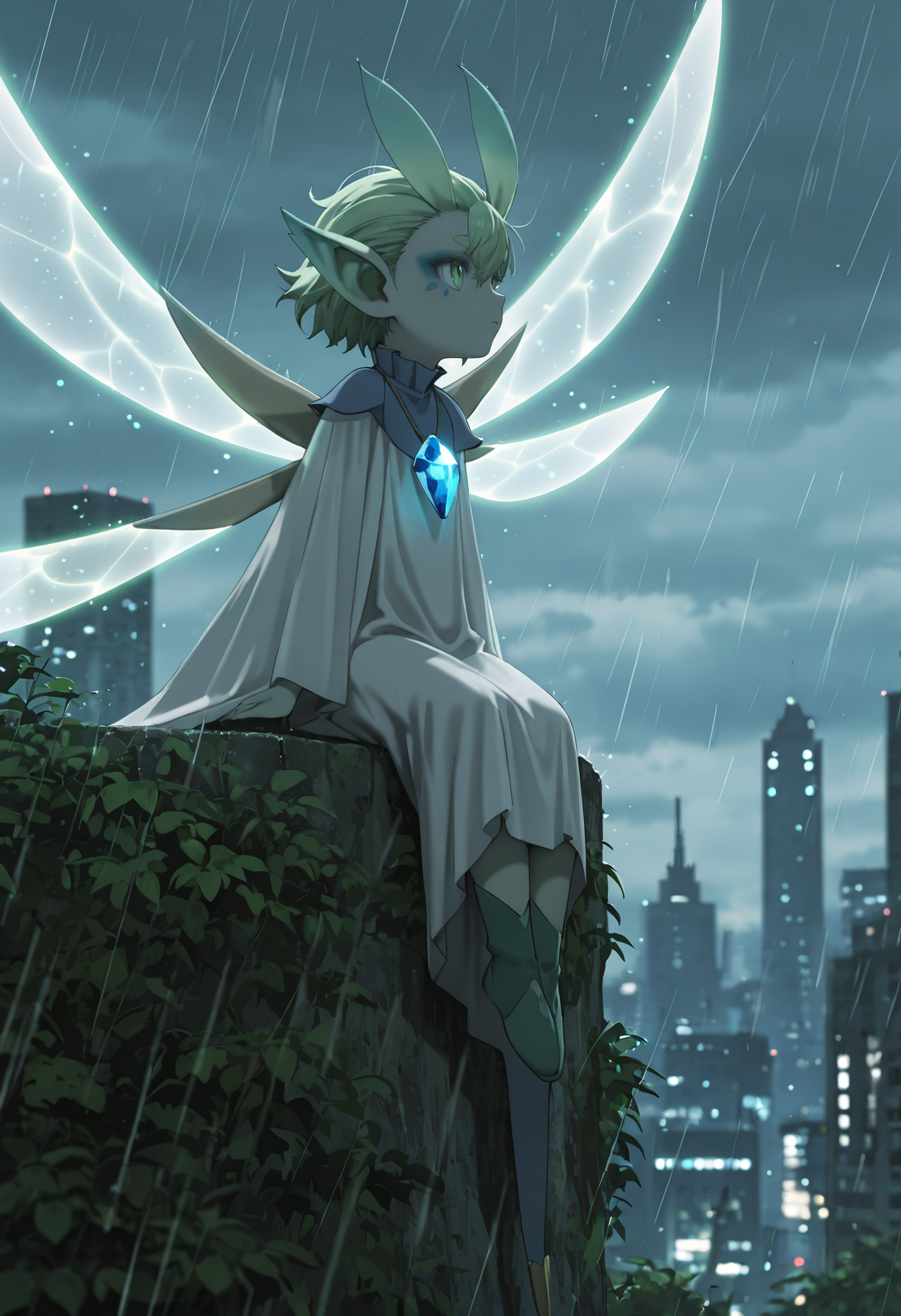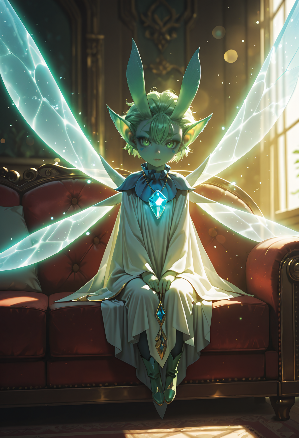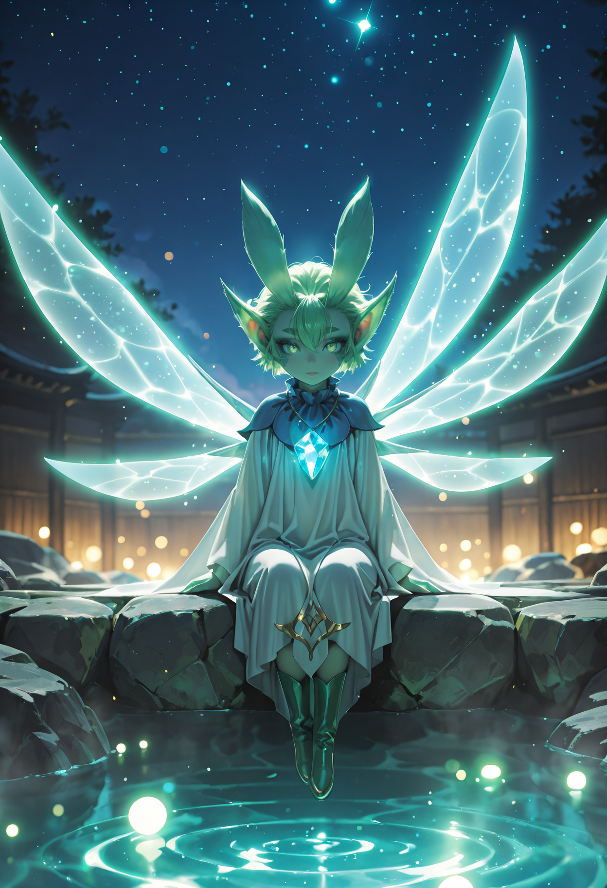 titixl、精霊、妖精、ミニ人物、色付きの肌、緑色の肌、緑色の目、縦に細長い瞳孔、太い眉、緑色の髪、短い髪、目の間の髪、尖った耳、顔の模様、妖精の翼、複数の翼、光る翼、
