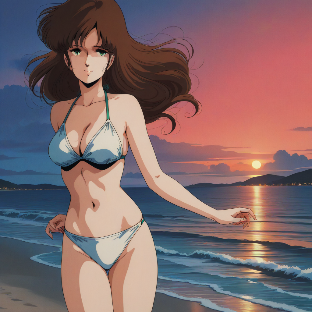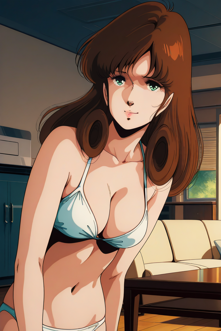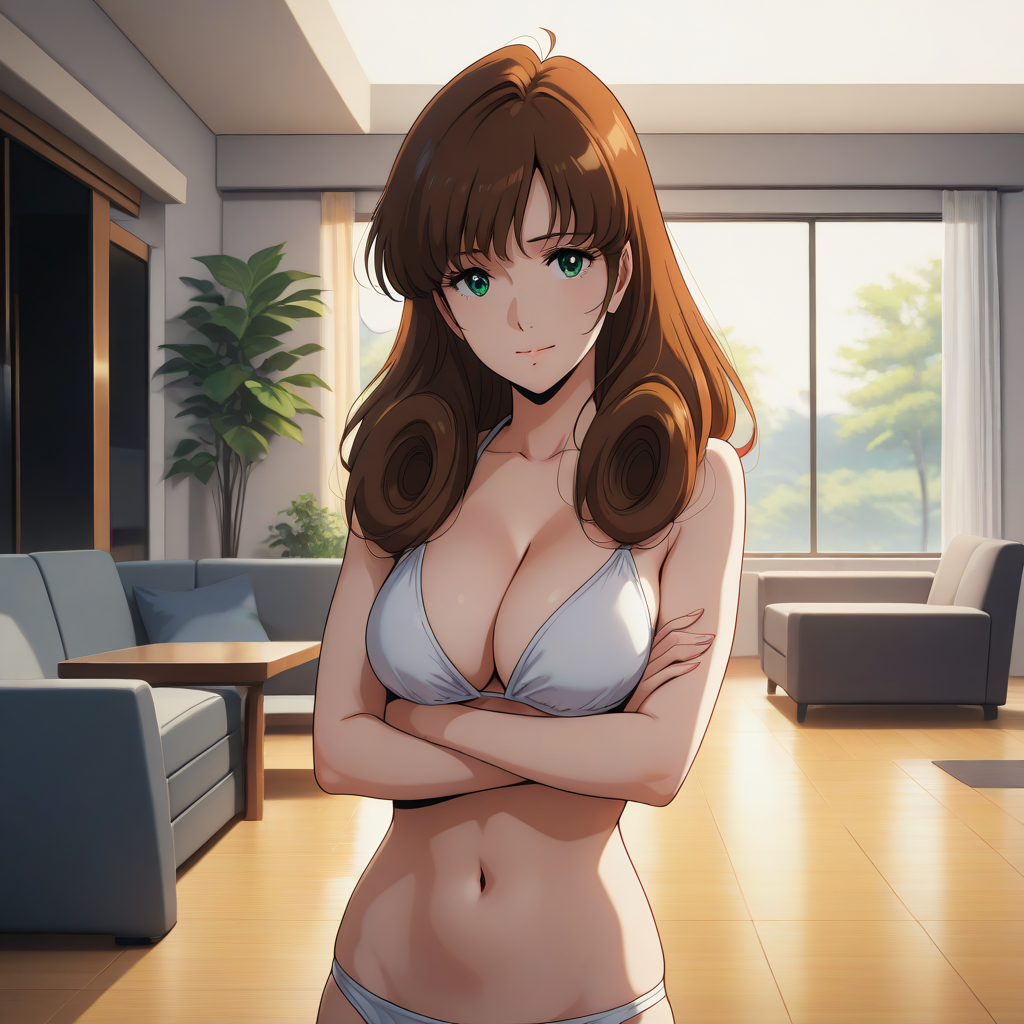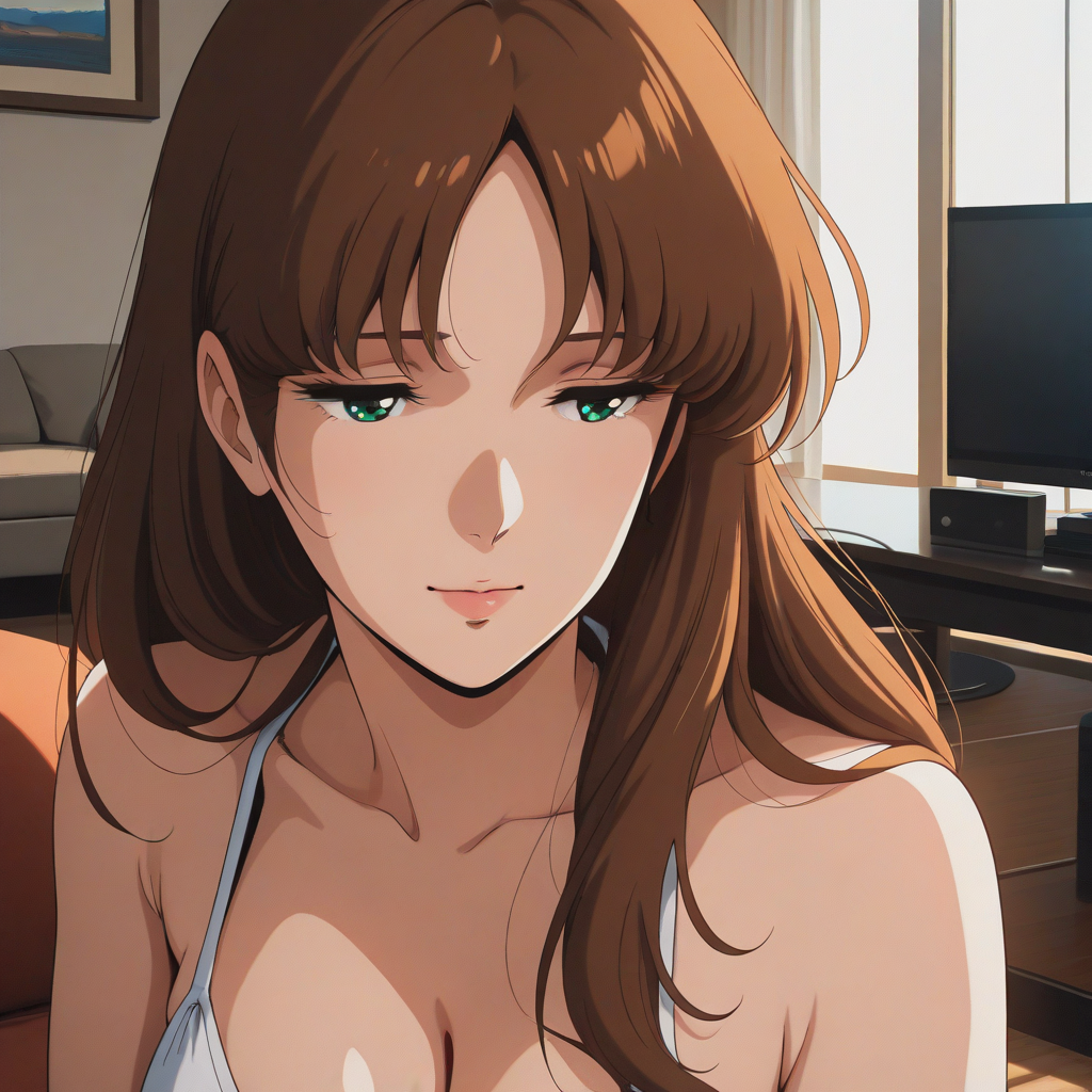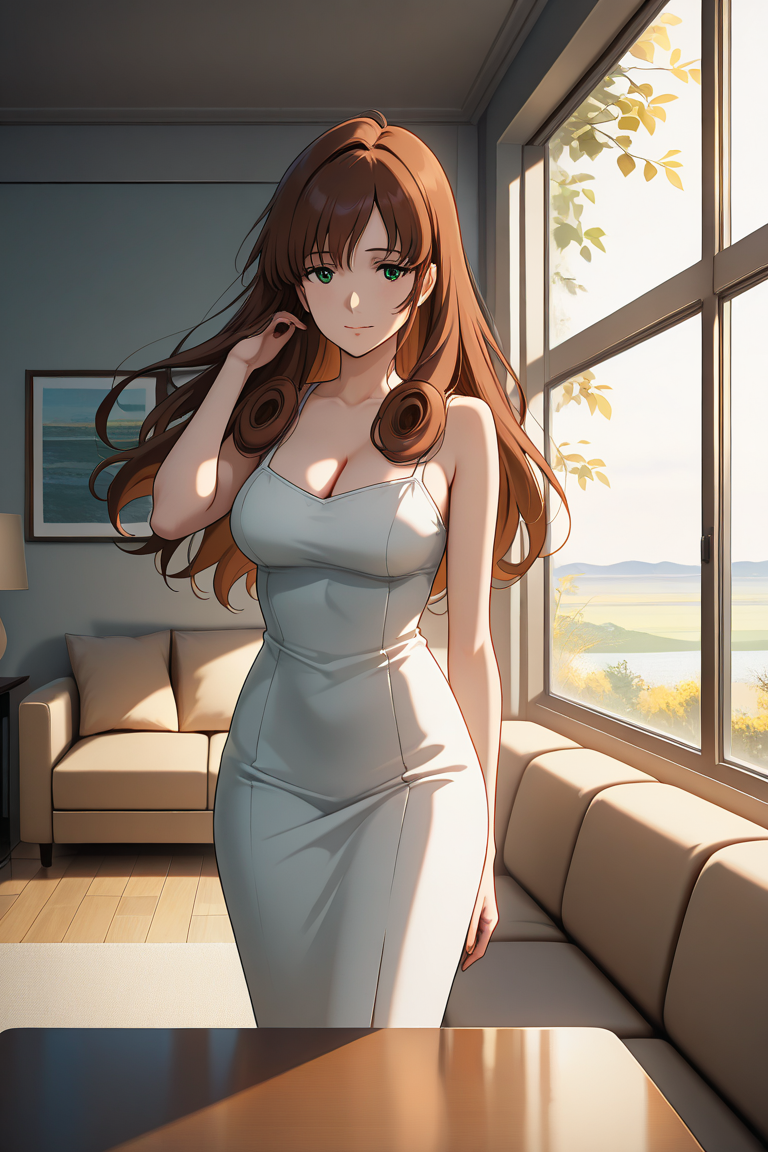 , anime girl, female, adult, brown hair, long hair, curled hair, spiral curls, green eyes, medium breasts, straight bangs, curly side streaks, slim waist.