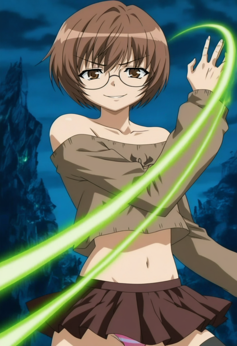 Miti, glasses, brown eyes, brown hair, midriff, navel, pink and white panties, Off-The-Shoulder Shirt, thighhigh stocking, mini skirt,