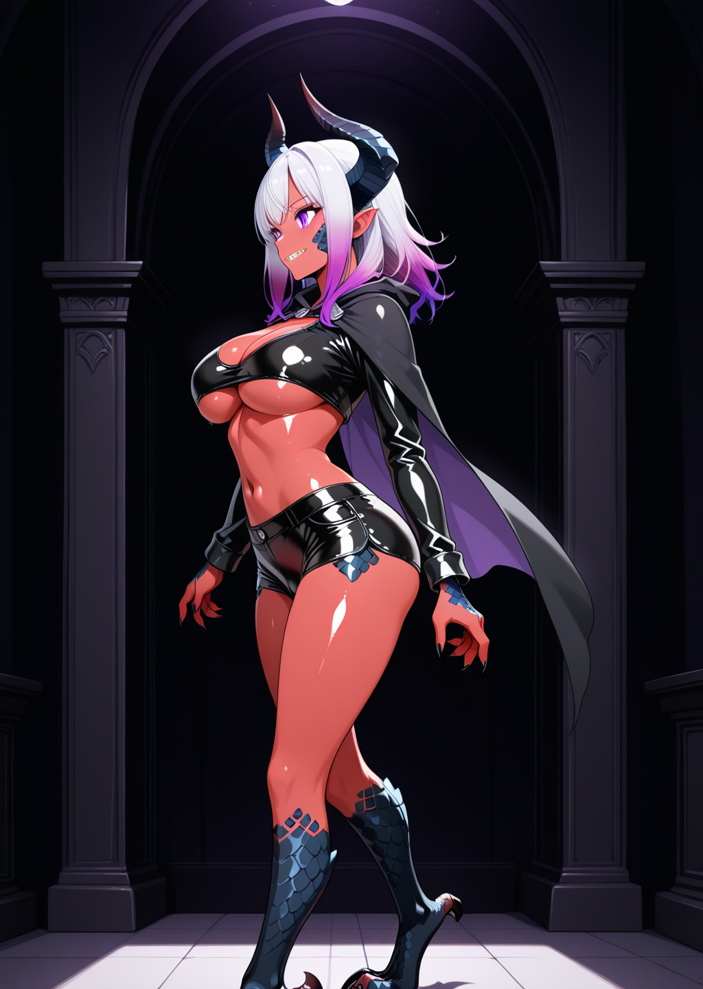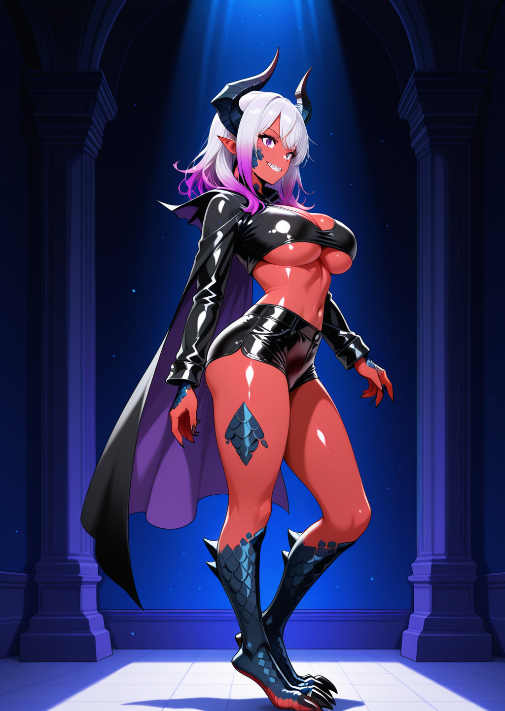 프롬프트: lucifa, 빨간 피부, 보라색 눈, 언더부브, 망토, 그라데이션 머리카락, 짧은 반바지, 수직 뿔, 측면 뿔, 라텍스 반바지, 드래곤 발, 검은 발, 비늘, 얼굴의 비늘, 젖가슴, 흰색과 보라색 머리카락, 뿔, 가슴,