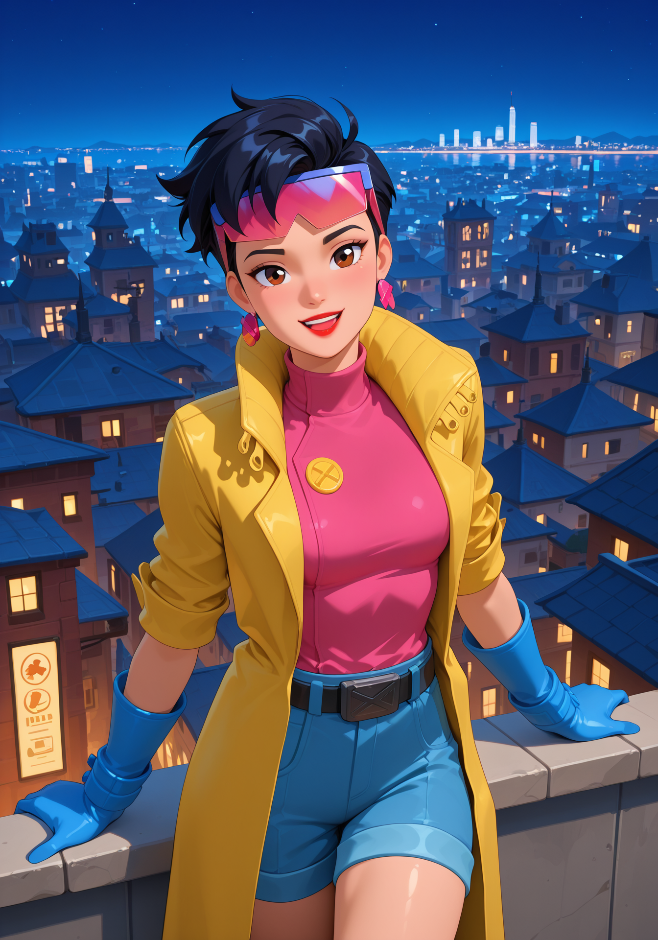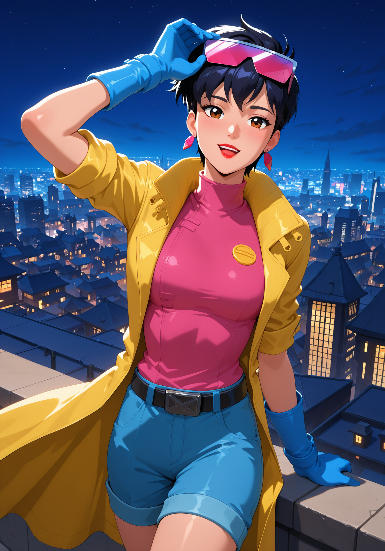 yellow trenchcoat, pink shirt,black belt, blue shorts, blue gloves, blue boots