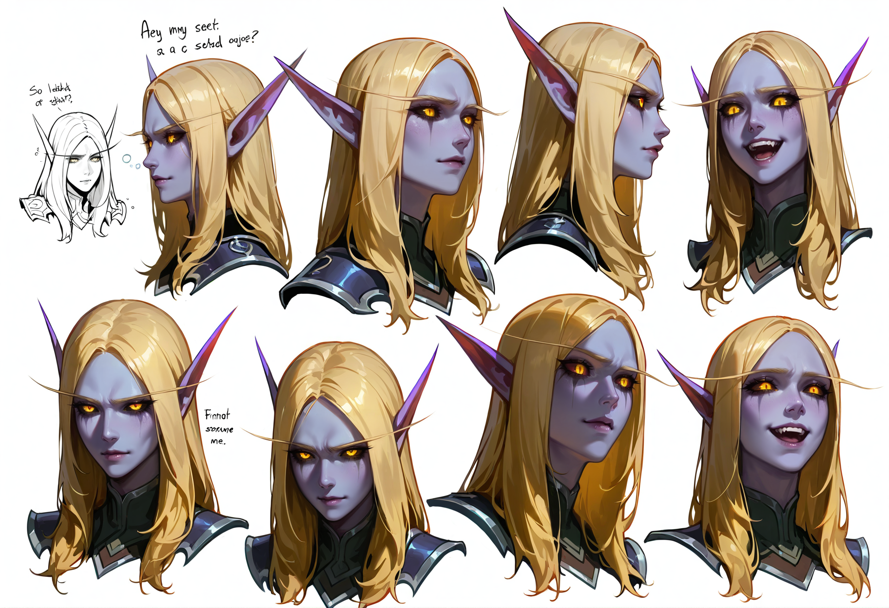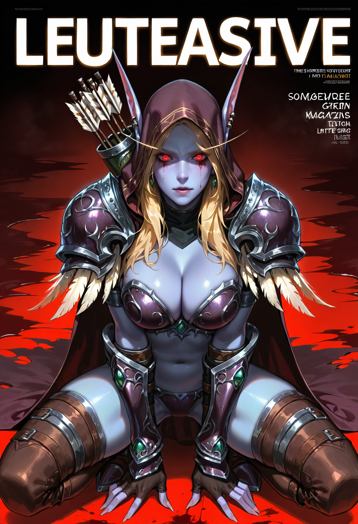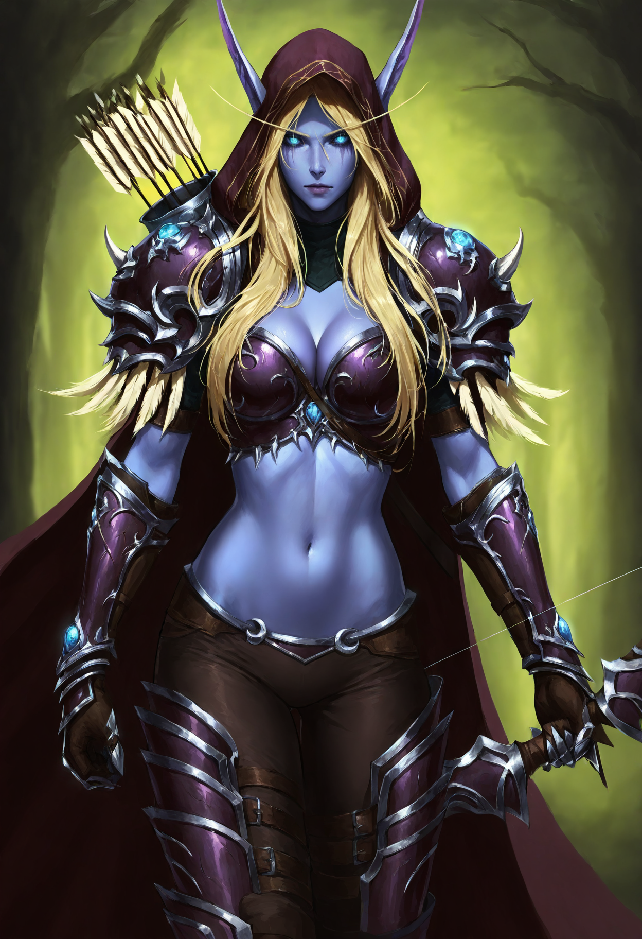 Sylvanas_R,1girl,빨간 눈,노란 눈,색깔 있는 공막,빛나는 눈,파란 피부,보라색 피부,색깔 있는 피부,긴 머리,금발,뾰족한 귀, 어두운 엘프