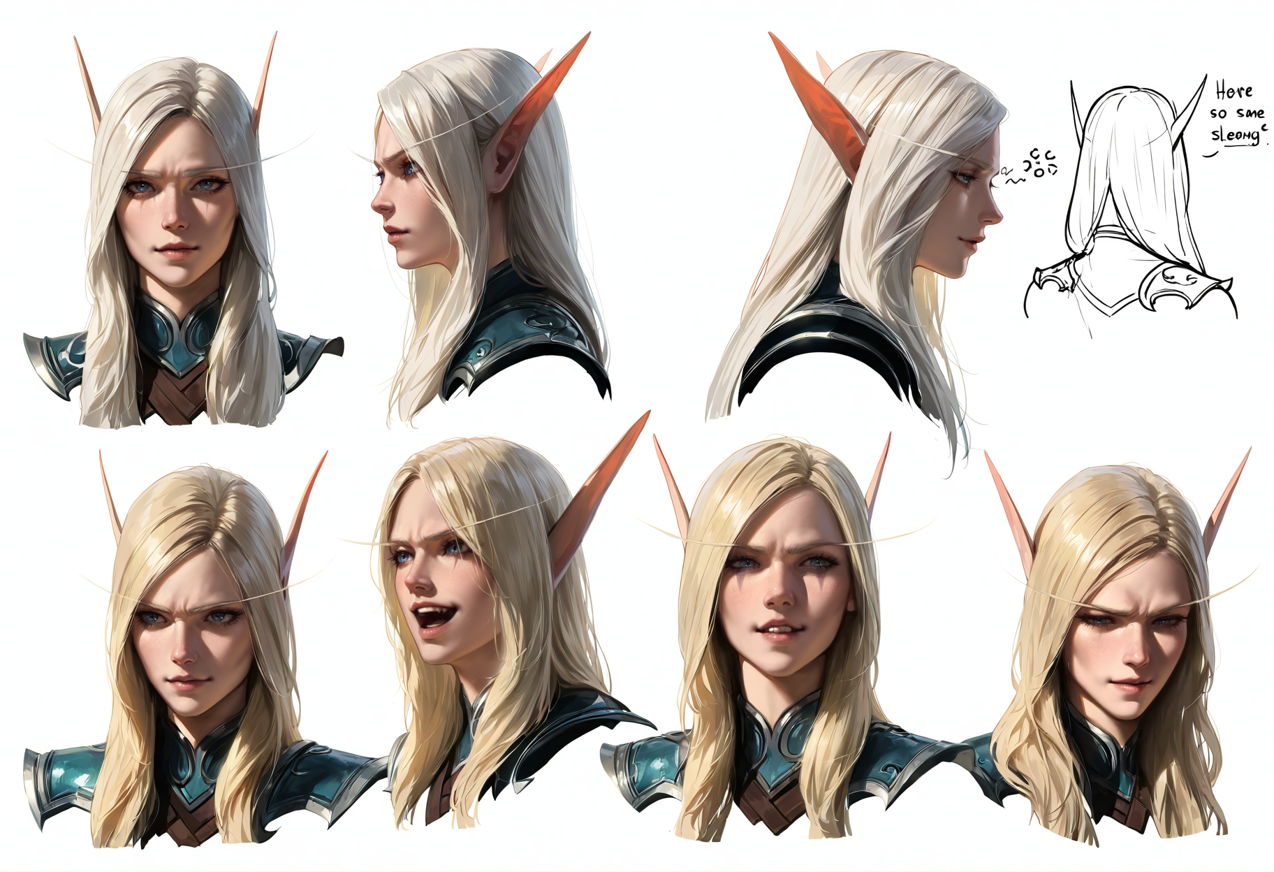 Sylvanas_B,1girl,파란 눈,금발,하얀 머리,긴 머리,코,입,뾰족한 귀, 엘프