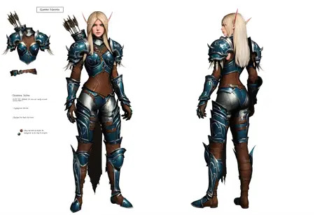 뿔, 갑옷, 후드, 가슴, 복부 노출, 어깨 갑옷, 부츠, 팔더런, 비키니 갑옷, 망토, 장갑, 바지, 깃털, 중간 크기 가슴, 큰 가슴, 장갑, 보석, 어깨 패드, 팔보호대, 무기, 활 (무기)