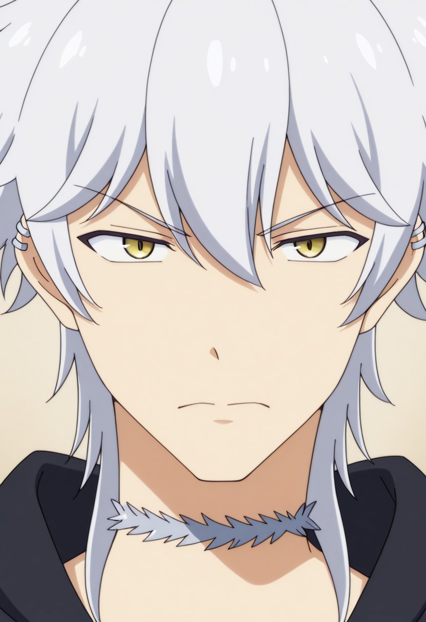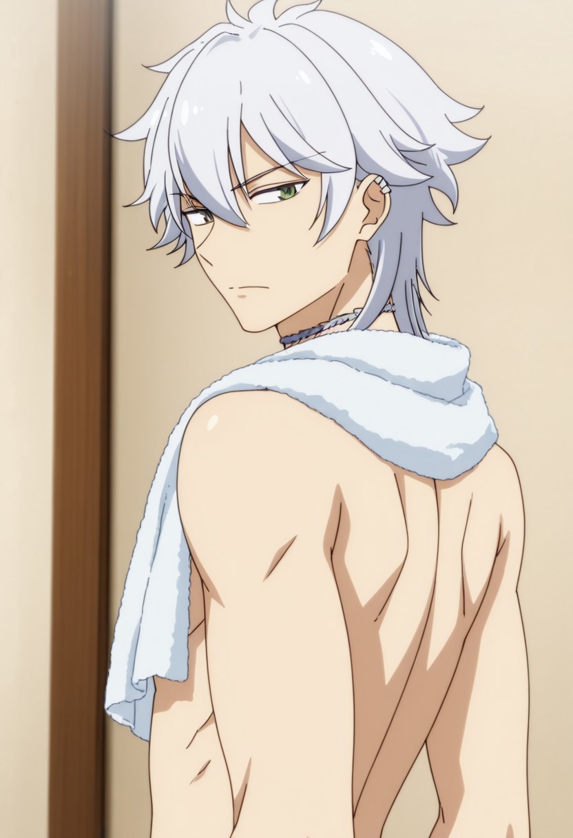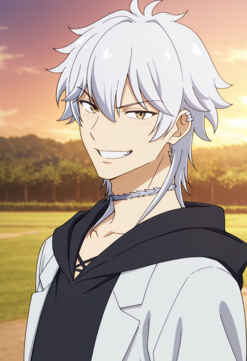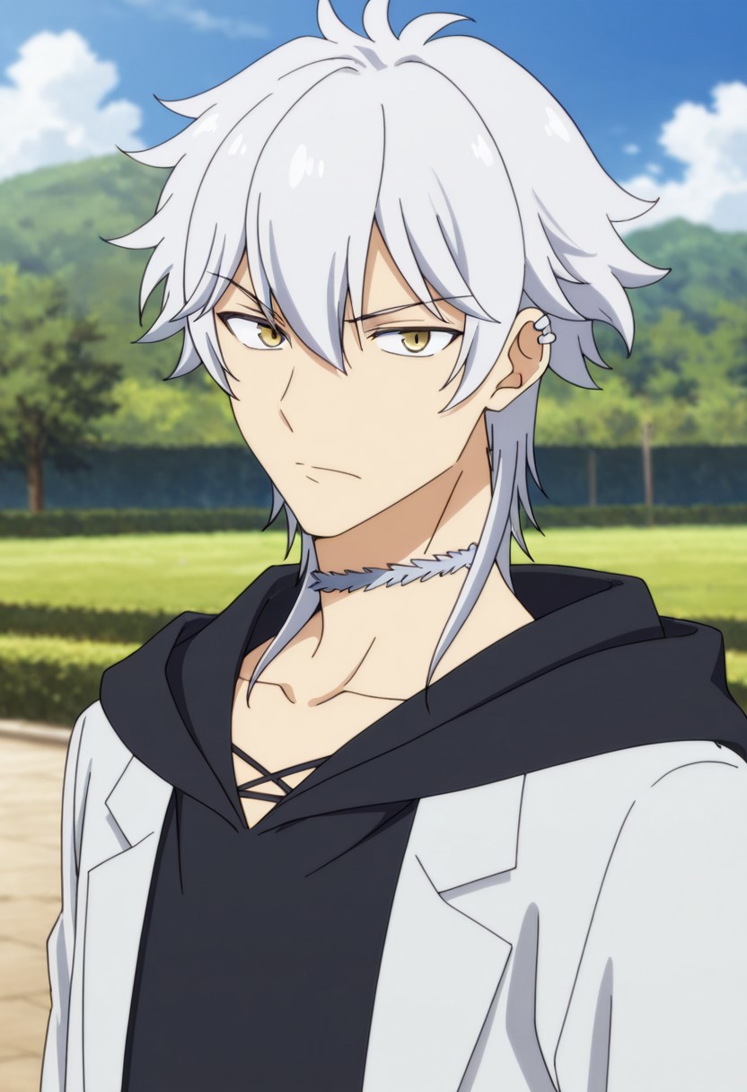 1boy, male focus, solo, green eyes, white hair, hair between eyes, earclip, collarbone, black hoodie, hood, white jacket, open jacket, bracelet, belt white pants,