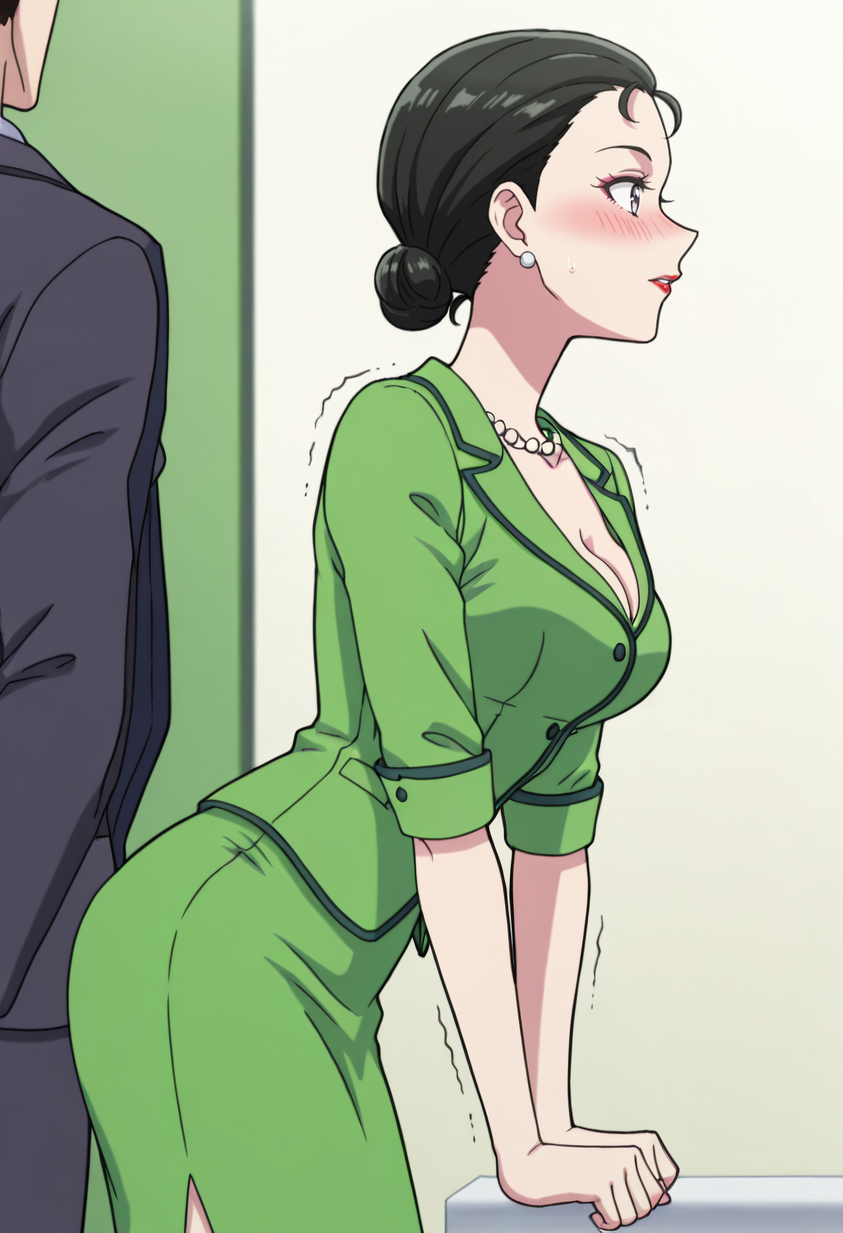 SecretaryGrDress, 보석, 목걸이, 정장, 공식 복장, 진주 목걸이, 가슴 노출, 귀걸이, 초록 드레스, 치마, 초록 치마, 드레스, 펜실 치마, 소매 말아올린, 치마 정장, 오피스 레이디, 진주 귀걸이