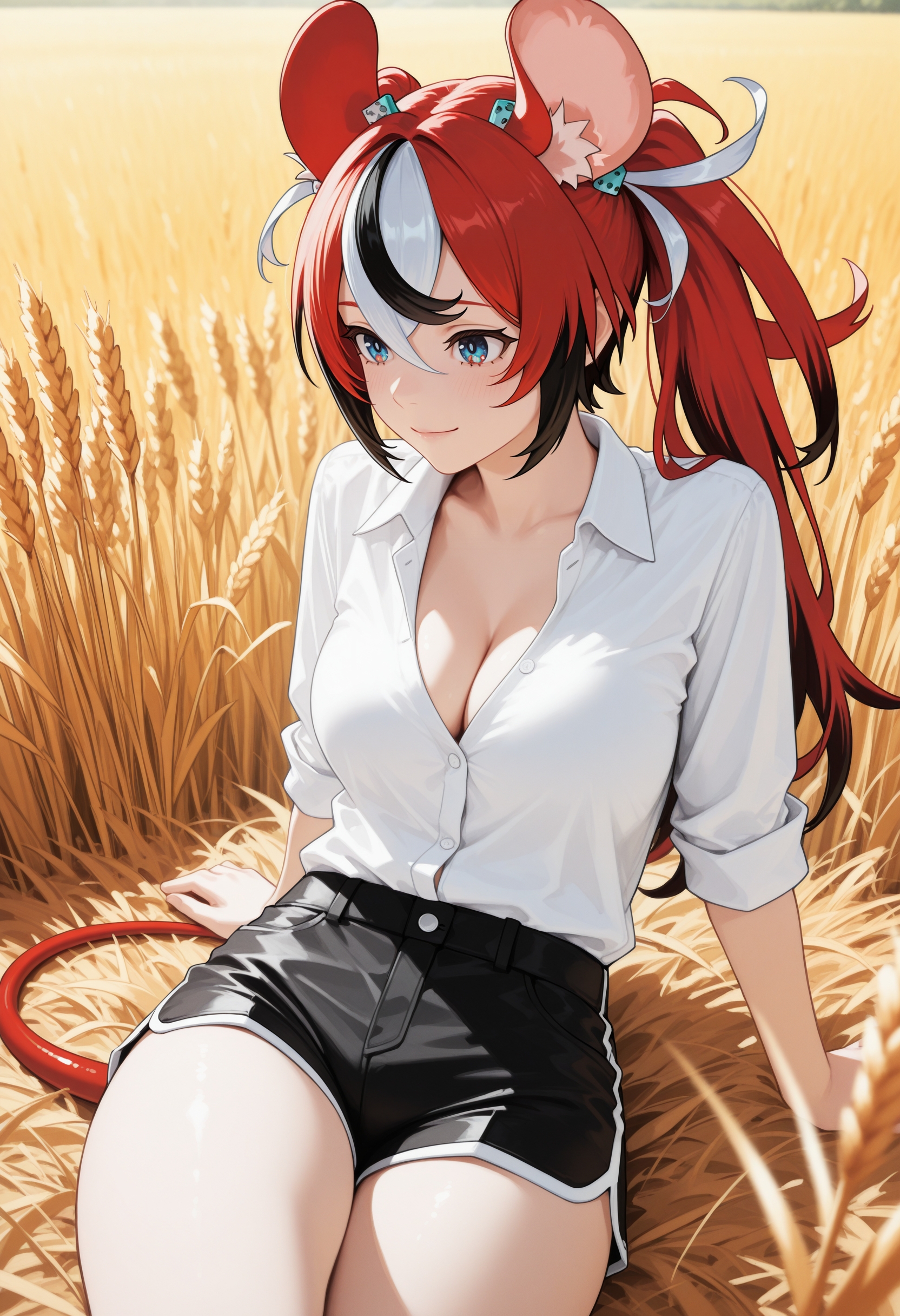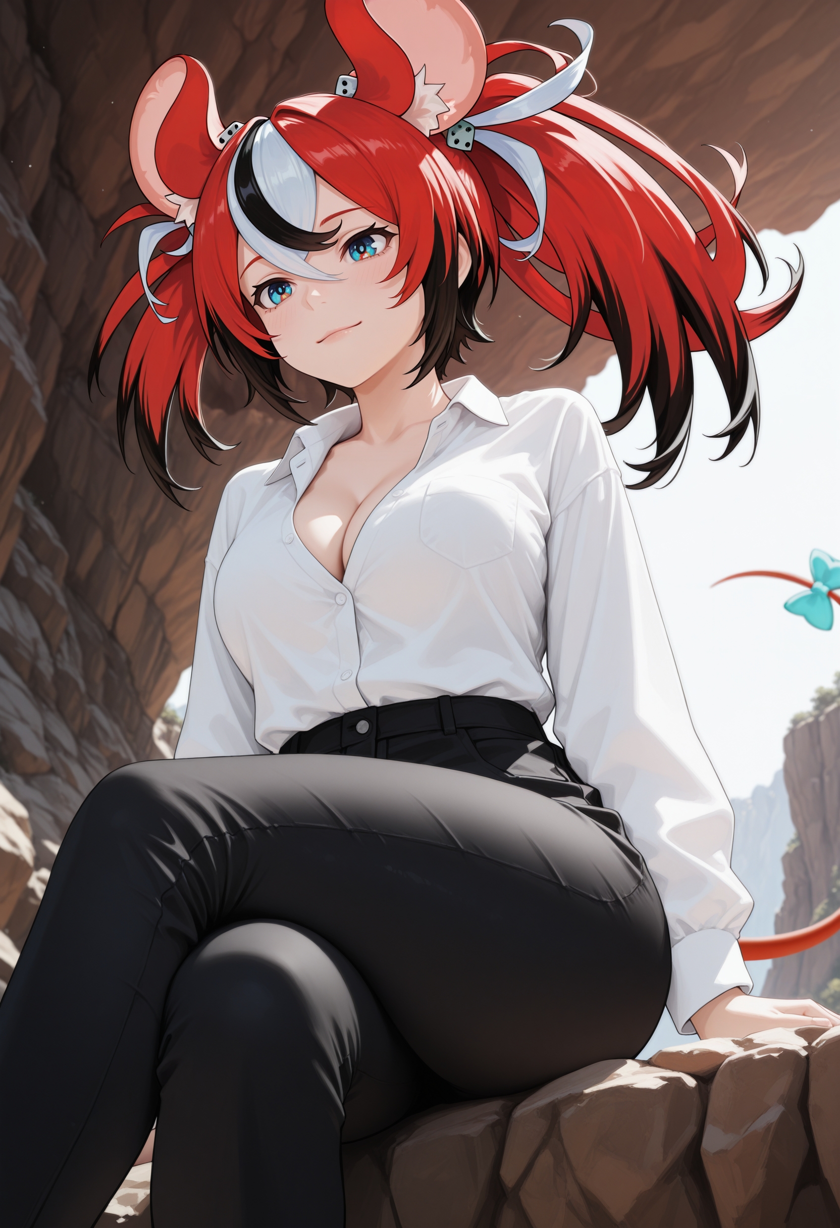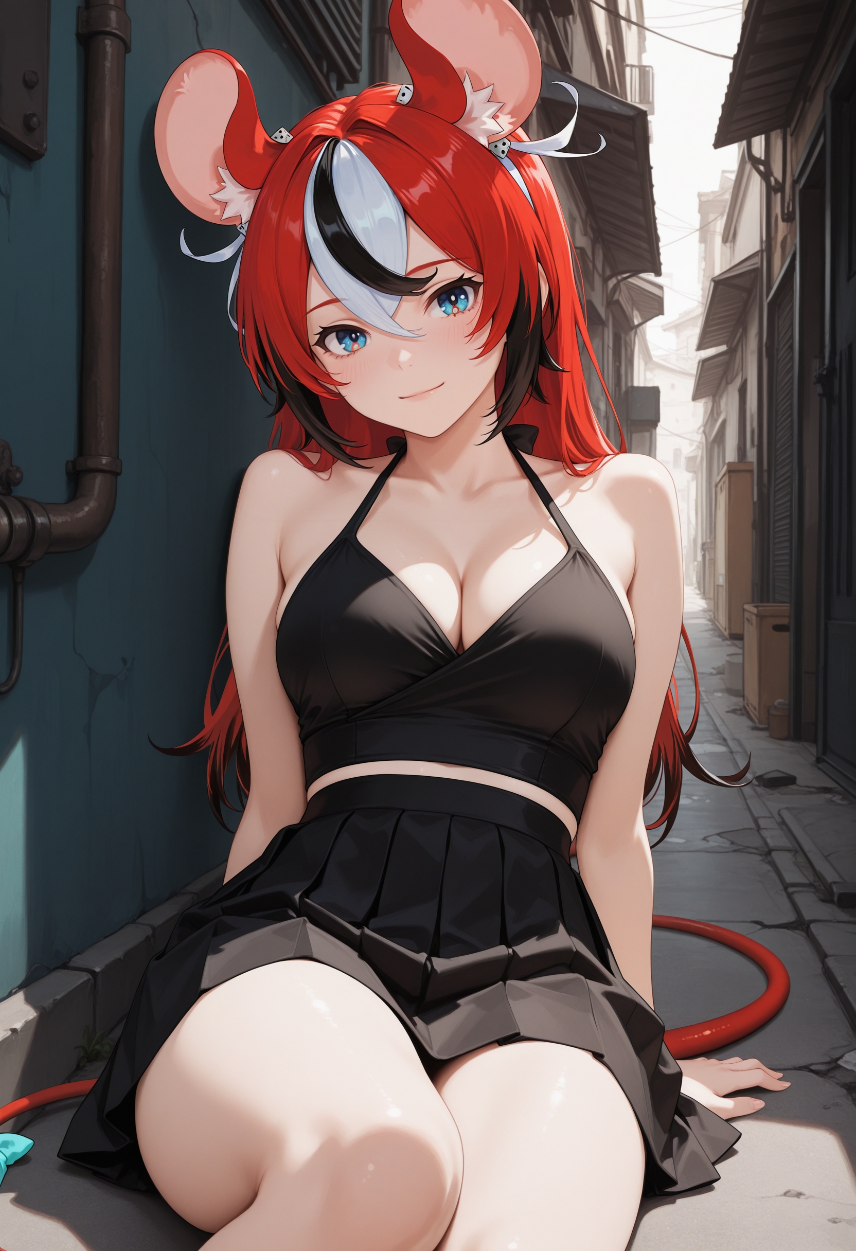(긍정적 프롬프트) hakos baelz, 마우스 소녀, 마우스 귀, 마우스 꼬리, 다채로운 머리카락, 줄무늬 머리카락, 빨간 머리카락, 검은 머리카락, 흰 머리카락, 파란 눈,