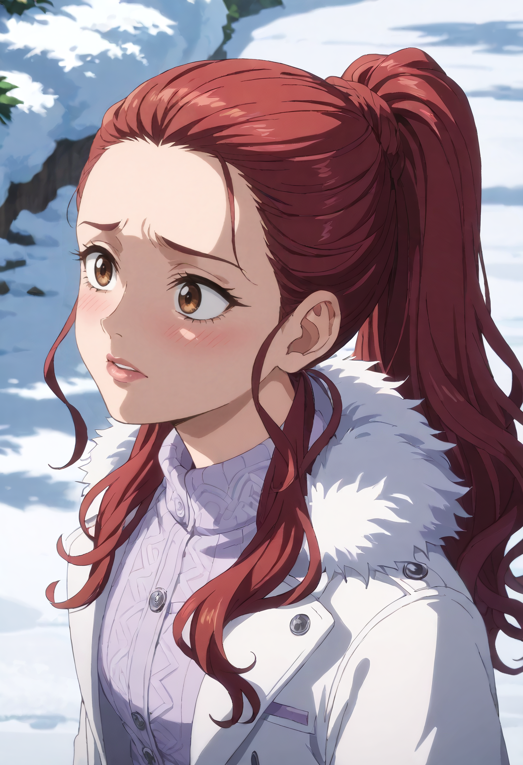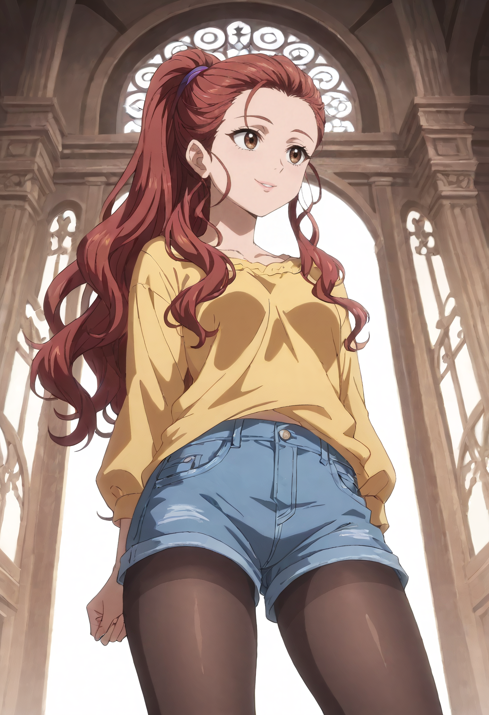 GZZSelena、長い髪、赤髪、ポニーテール、波状の髪、高いポニーテール、茶色の目、額
