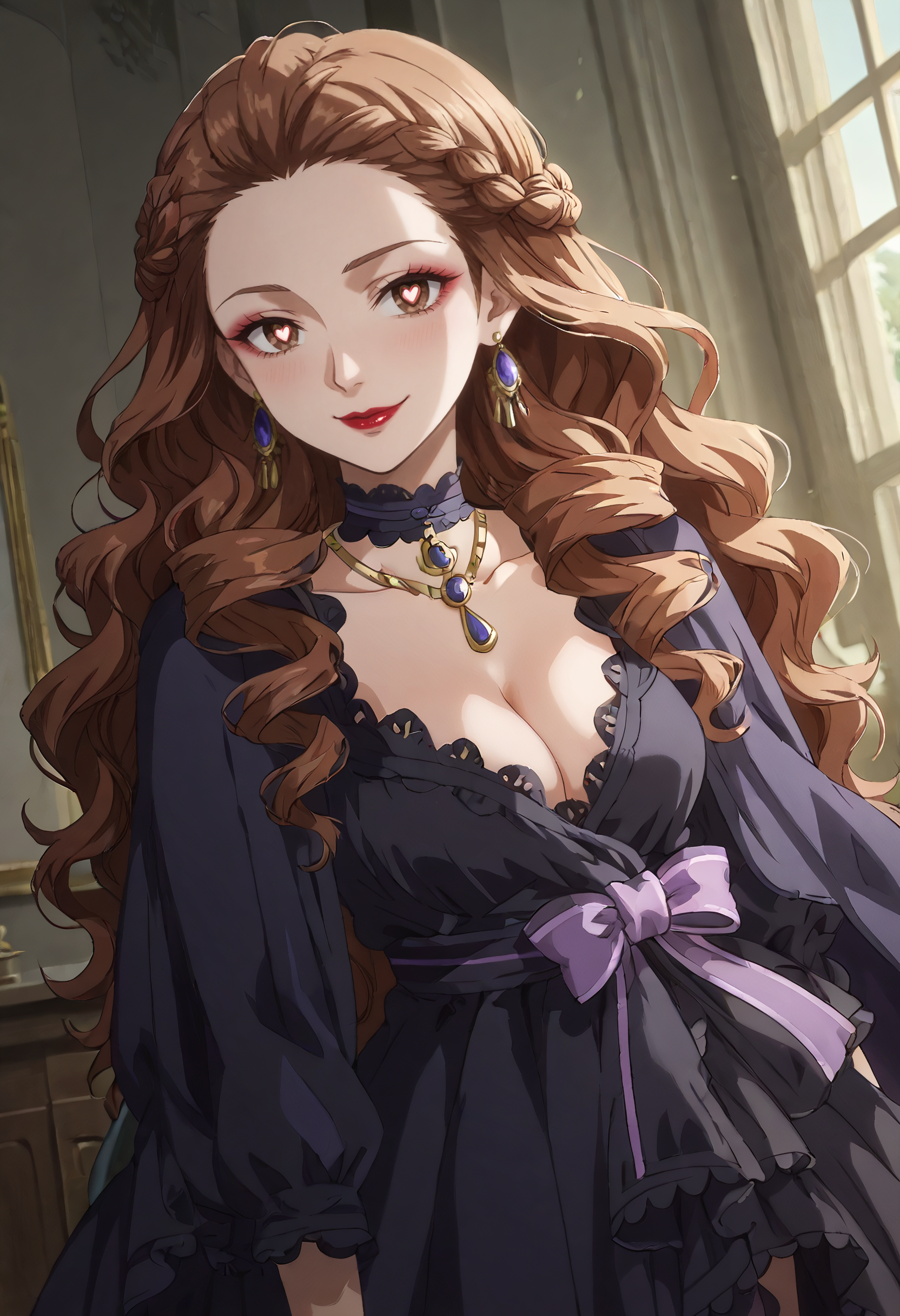 SharonOutfit、ドレス、胸元、イヤリング、ジュエリー、フリル、紫のリボン、リボン、マント、チョーカー、ネックレス、青いチョーカー、黒いナイトガウン、ナイトガウン、