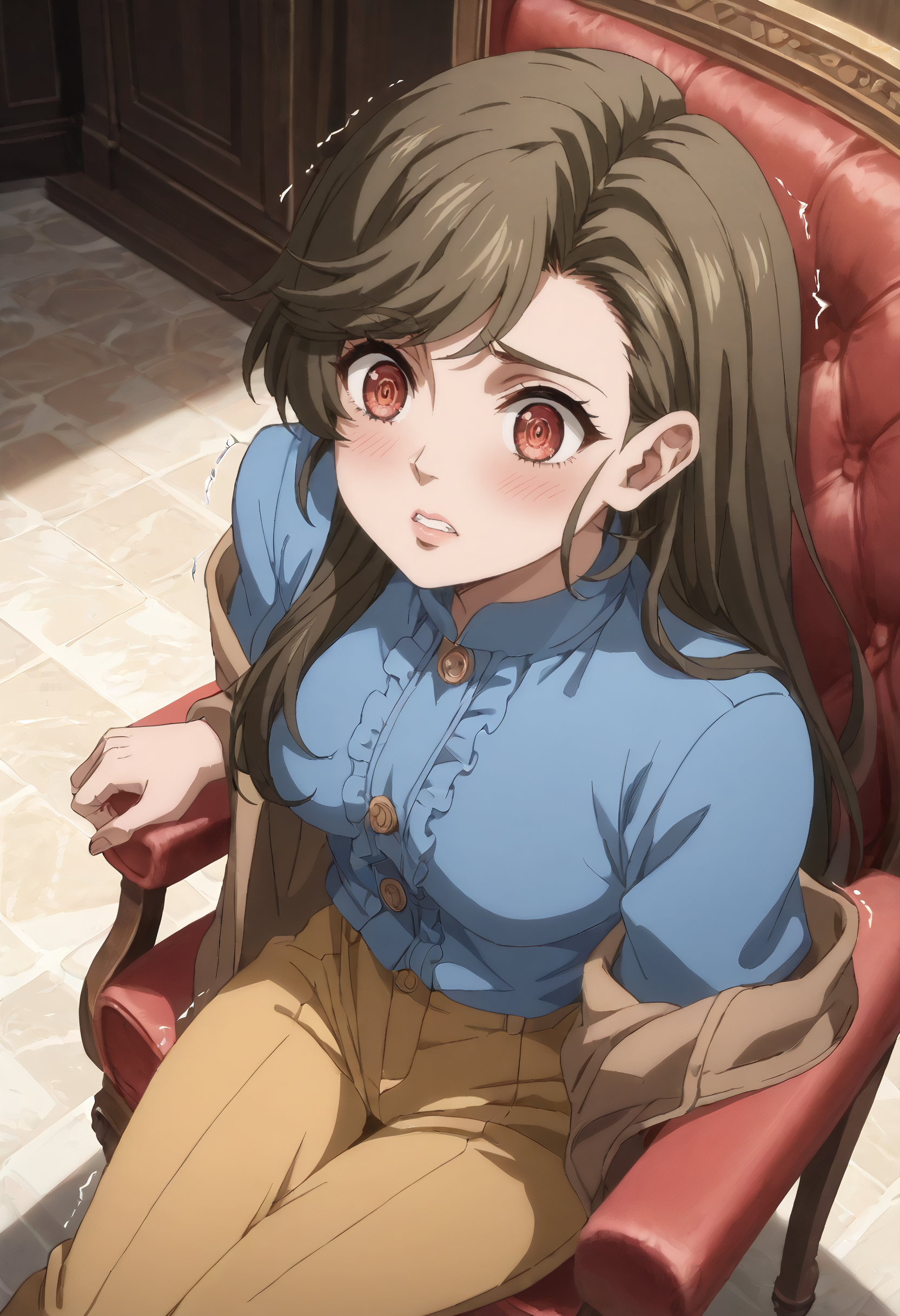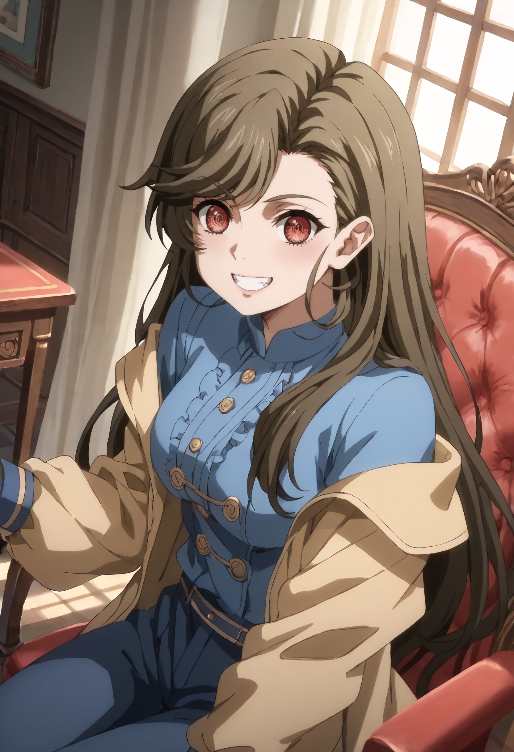 GZZMelissa, 긴 머리, 갈색 머리, 붉은 눈, 검은 머리, 쓸어올린 앞머리, 비대칭 앞머리,