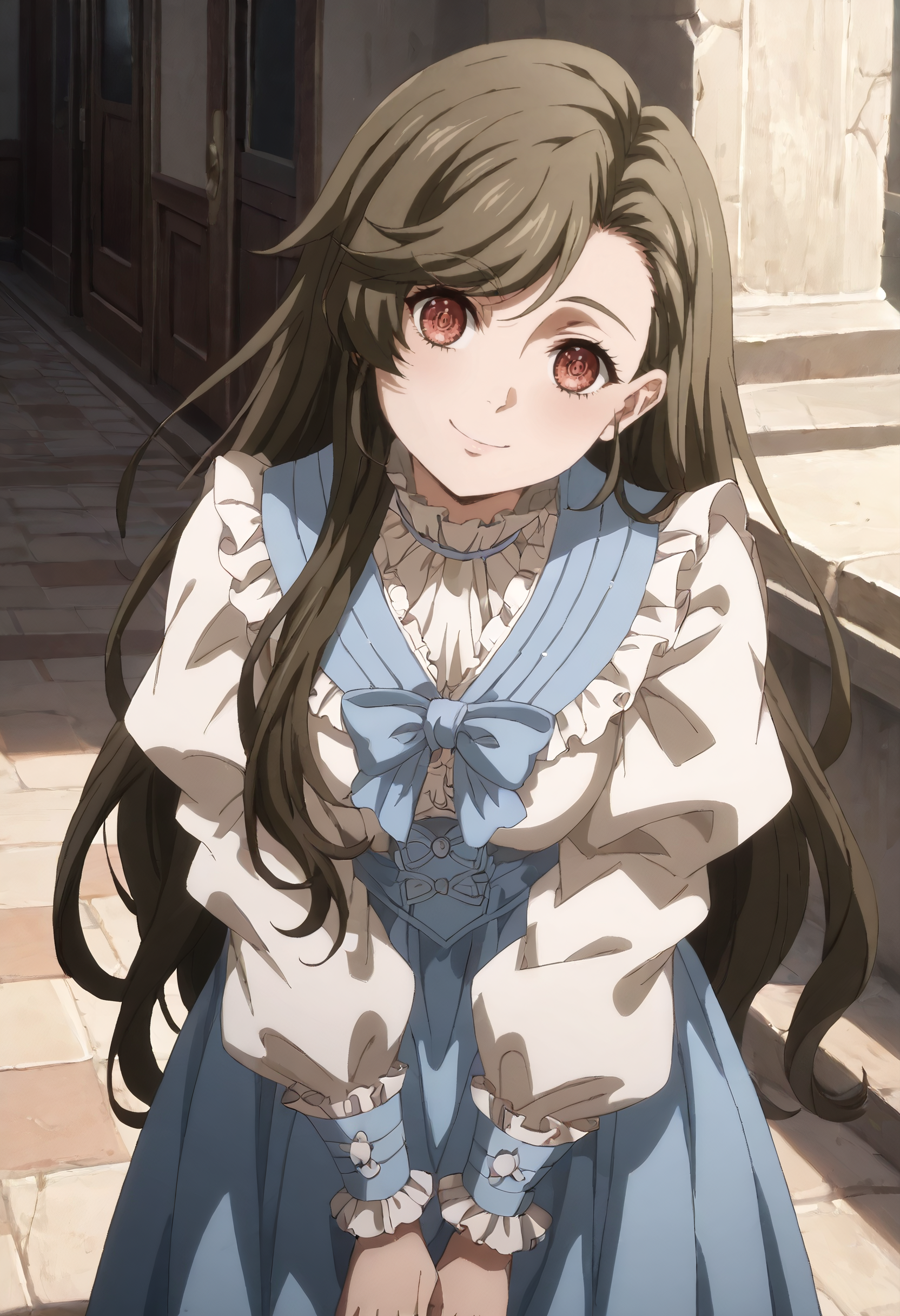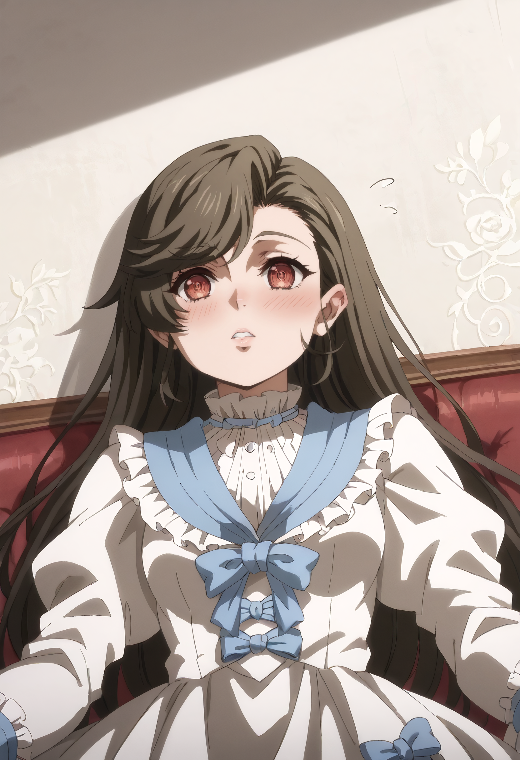 MelissaOutfit, 드레스, 프릴, 흰 드레스, 긴 소매, 리본, 풍성한 소매, 프릴 드레스, 파란 리본, 빅토리아풍, 프릴 칼라, 파란 넥타이, 드레스 리본,